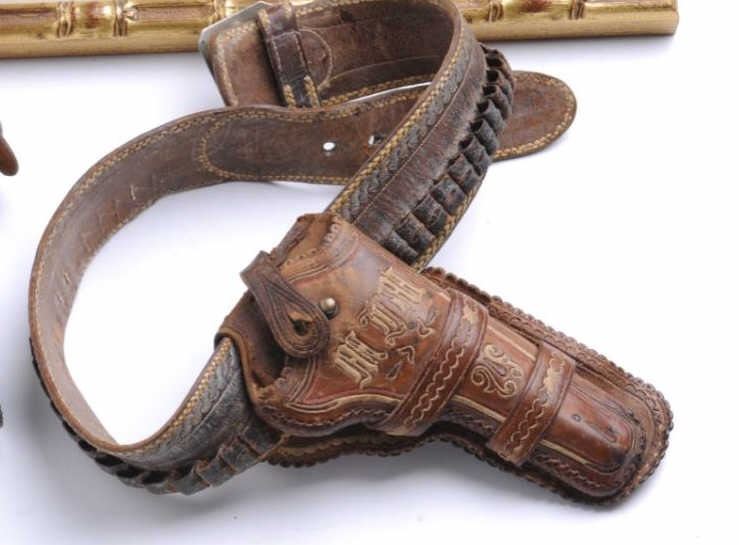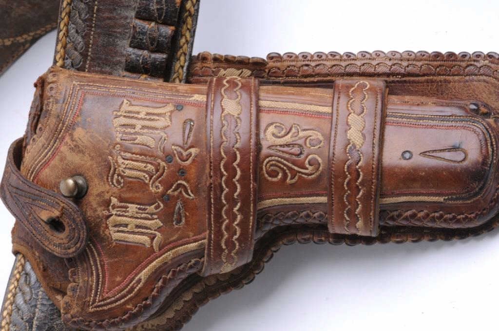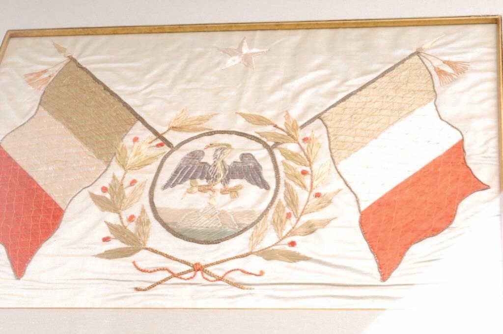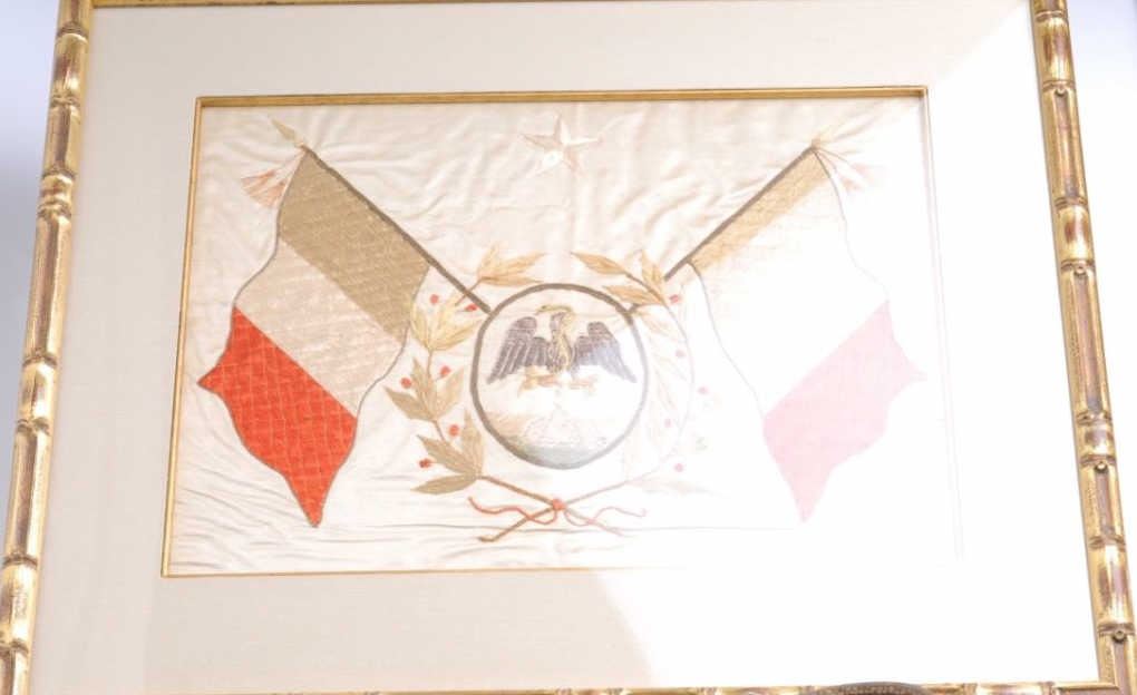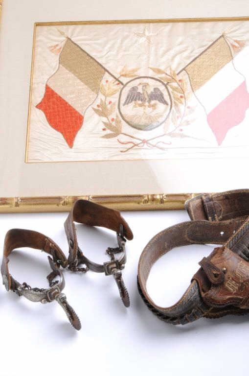 Silver mounted engraved and inlaid spurs with leather straps accompanied by a pitiado double loop holster and cartridge belt, all in overall worn but good condition; collected together over 35 years ago; holster appears to be for a mediumframe revolver; accompanied by a great old framed and matted silk embroidered banner with crossed Mexican flags, snake and eagle and five-pointed lone star in very good condition; approximately 23” x 28” overall. Est.: $500-$1,000.