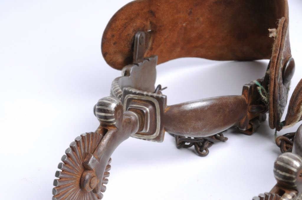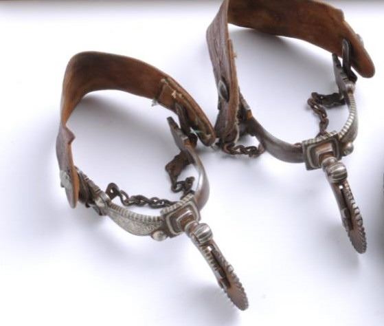 Lot 373 Silver mounted engraved and inlaid spurs with leather straps accompanied by a pitiado double loop