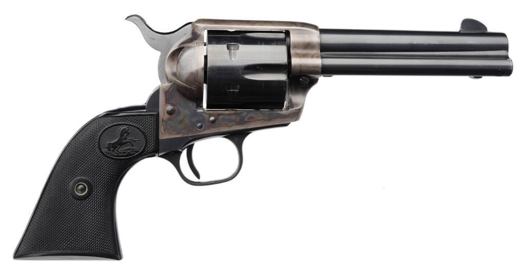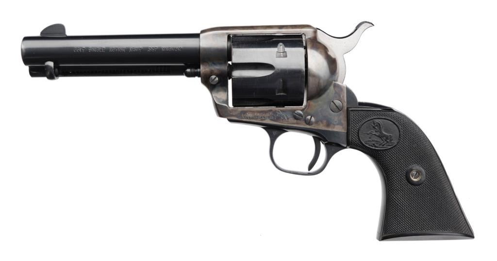 **Colt 2nd Generation SAA revolver, .357 Magnum caliber, 4.75” barrel, S/N 38309SA, blued and case hardened finish, checkered hard rubber grips in excellent condition overall and with factory “stagecoach” two-piece cardboard box with lidmarked in pen “To Barry Rolling/gift from Grama Doll/In memory of Uncle Lawrence”. Est.: $2,000-$2,500.