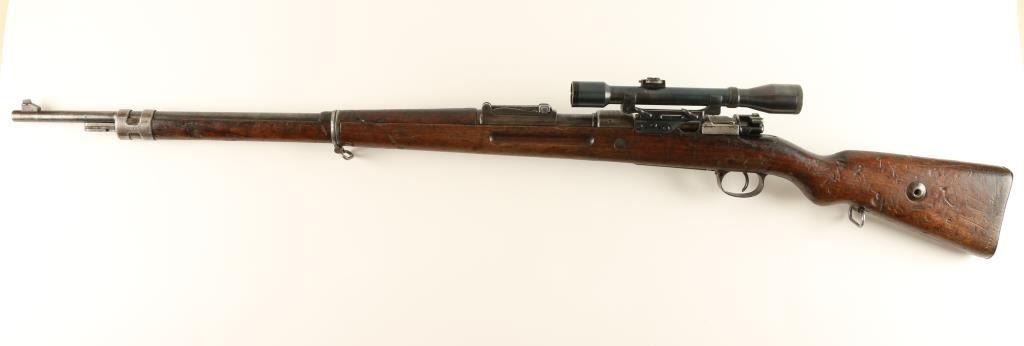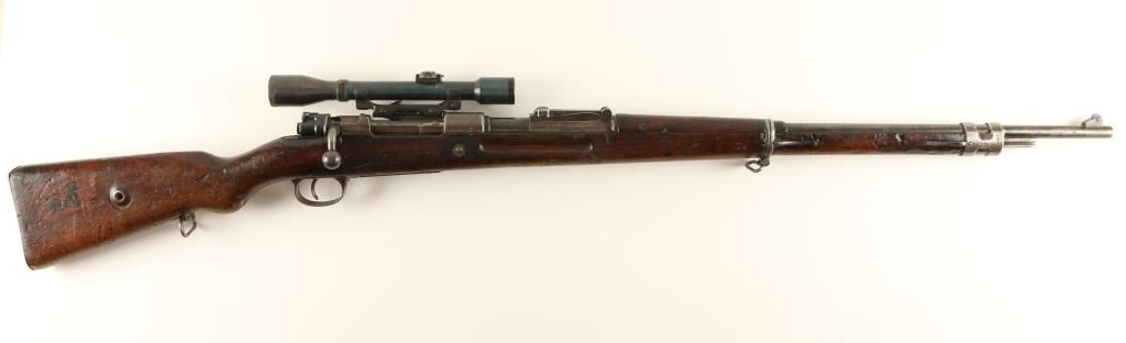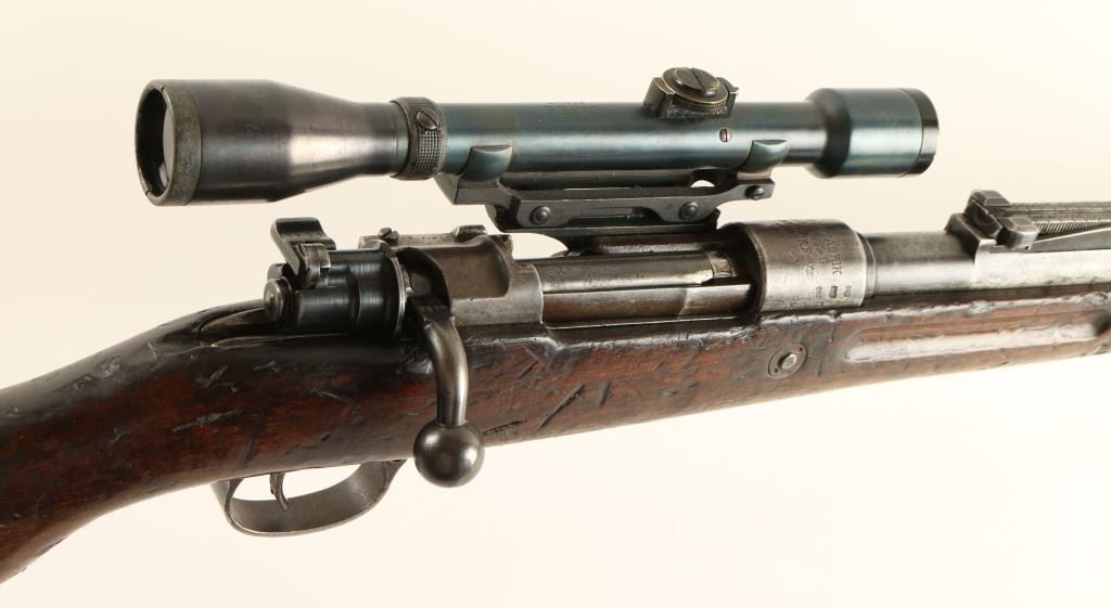 Mauser Gewehr 98M 8mm S/N 5530 Rebuilt WWI era German military bolt action service rifle chambered in 8mm Mauser. Manufactured by Mauser, Oberndorf circa 1916 and imported by CAI, St. Albans, Vermont. Features a 29" barrel, rampedfront sight, 2,000 meter graduated rear sight, unmarked side mounted scope base #334, Oigee 4x 26mm scope #305004, Imperial proofed receiver, two barrelbands, bayonet lug, sling swivels, safety switch on bolt, and wood handguard & semi-pistol grip shoulder stock with smooth metal buttplate. Serial numbers match on barrel & receiver. Wood stocks bare many markings and are near good in condition with above average blemishes. Rifle's finish has drifted to a dark grey on the barrel and to a light brown patina on most other metal surfaces with pitting on bolt release lever. Action is smooth, bore is very good, and optics are clear with little wearon scope tube. Condition is good+. ***C&R/MODERN EST:$900.00 - 1,800.00