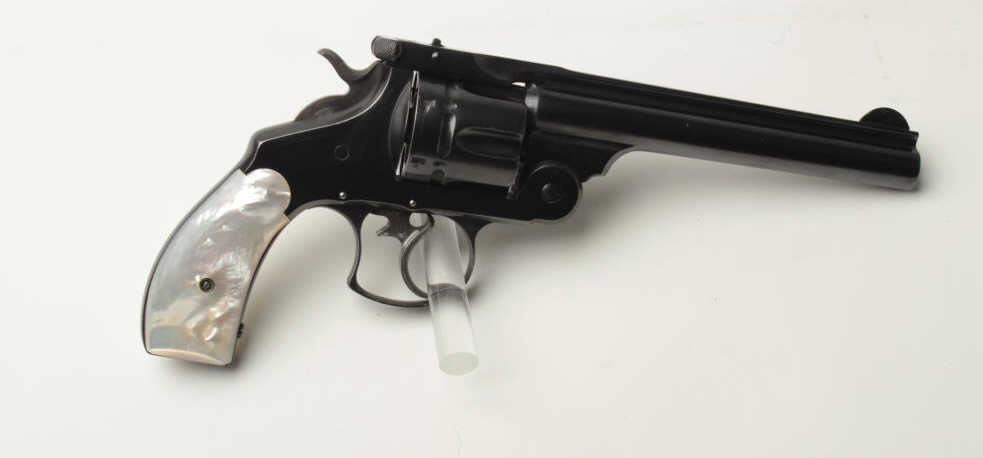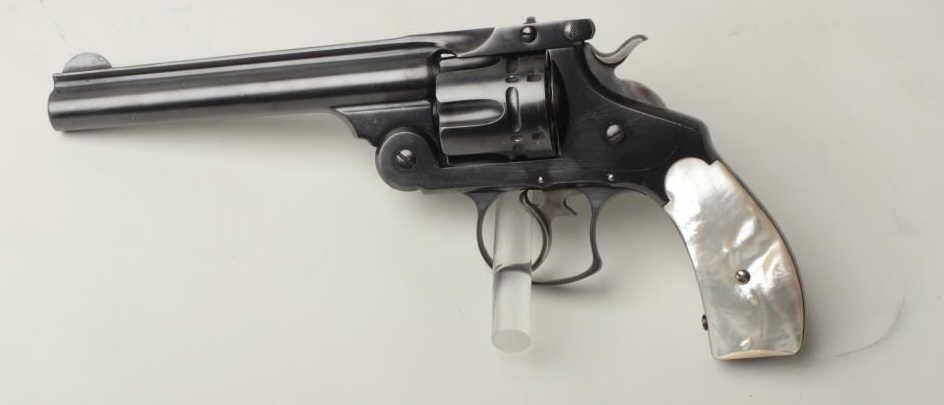 Smith & Wesson 1st Model D.A. Revolver in .44-40 caliber with a 6” barrel, re-blued finish, pearl grips, S/N 5291. Factory quality re-blue with sharp edges and good address. Muted original case colors about 60% remaining on the hammer andtrigger. Mechanically excellent and tight with a good bore. Frontier era. (Antique) Est.: $1,000-$2,000