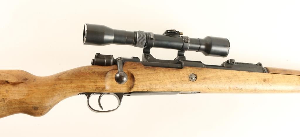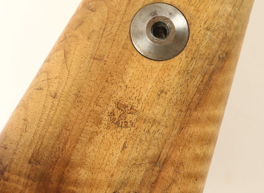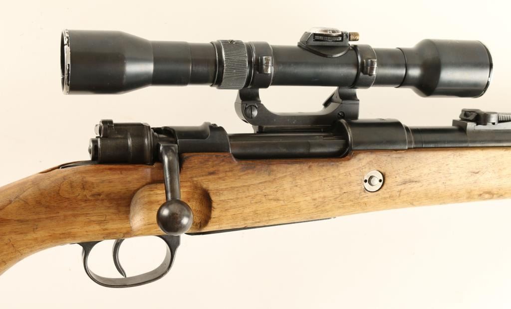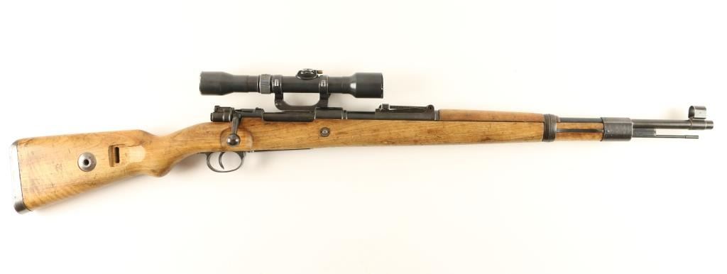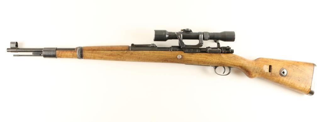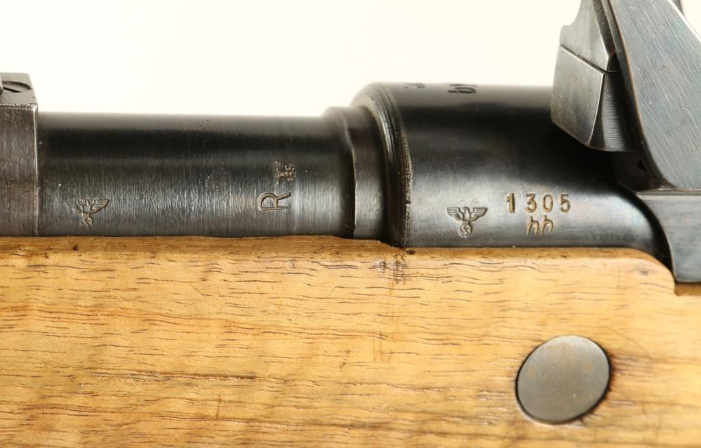 German K98 'byf42' Sniper 8mm S/N 1305 Nazi proofed bolt action sniper rifle, manufactured by Mauserwerk circa 1942. This mid-war production rifle features a blued finish, 24" tapered barrelstamped 'Eagle/135' & 'R', ramped & hooded front sight, 2,000 meter graduated rear sight, side mounted Hermann Weihrauch short rail scope mount #1876, unmarked 4x scope in the style of Hensold Wetzar, receiverstamped 'Eagle/135', two barrel bands, bayonet lug, cleaning rod, internal magazine, and wood handguard & semi-pistol grip shoulder stock with smooth metal buttplate. Matching serial numbers on receiver,barrel bands, trigger guard, floorplate and bolt parts. Wood stock is stamped three times with Waffenamp 135 and is in overall very good condition with less than average blemishes. No import marks, and buttplate isstamped with 'brg' code. Rifle retains 85% original war-time finish with light even wear. Action is smooth, bore is excellent, and optics are clear with light flaking on scope tube. Condition is near