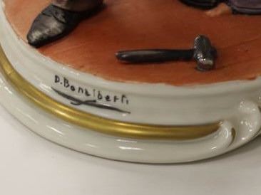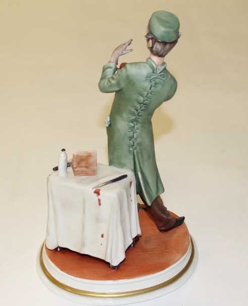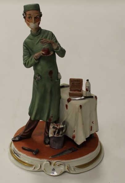 Capi Di Monte “Works of Art” hand sculptured, Italy #476 with crown “N” mark. Figure of heart surgeon and somewhat gory. D. Benaiberti artist signed. Measures 11” in height. Est.: $200-$400