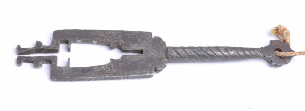 Lot of three 15th-17th century locks with keys. All working and keys original. 1 with fancy engraving. Many early gun makers also were lock smiths and several used keys as markings. Est.: $300-$600