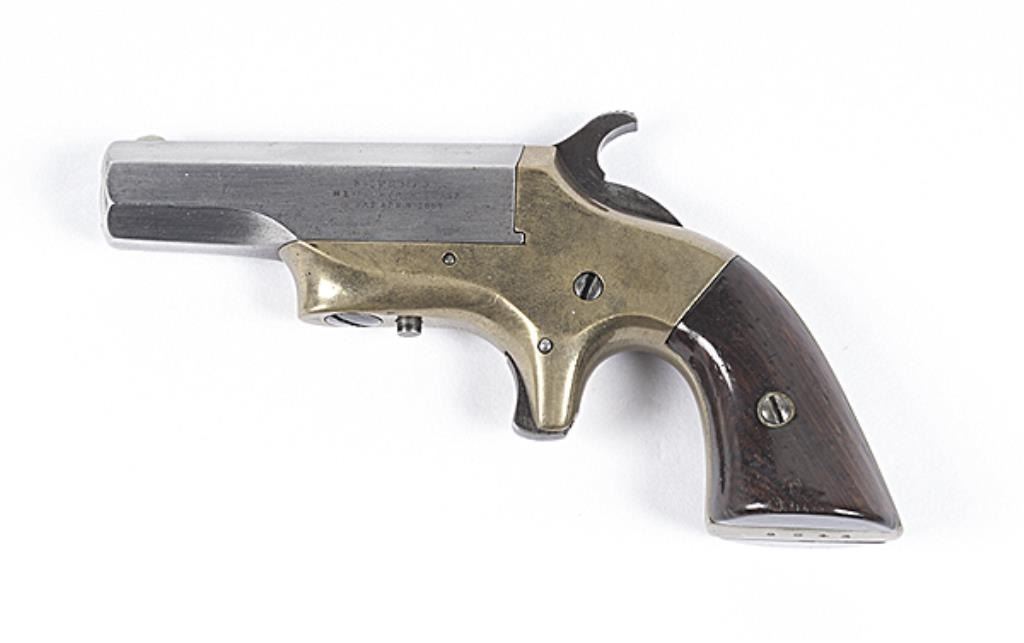 Brown Mfg. Southerner Deringer, .41 rimfire caliber, 2.5" octagonal barrel length, S/N 3542, top of barrel marked "Southerner" and left side of barrel marked "Brown MFG." over "Newburyport, Mass" over patent date. Blued barrel with brassframe and walnut grips. Barrel has been lightly cleaned but markings are still sharp. Brass has a yellowing patina and the grips are good with minimal wear. Bore is good. Mechanically good. Est:$200-400
