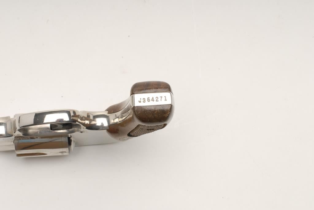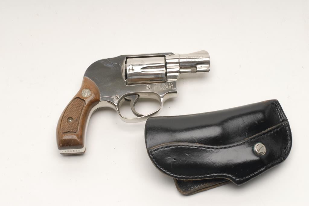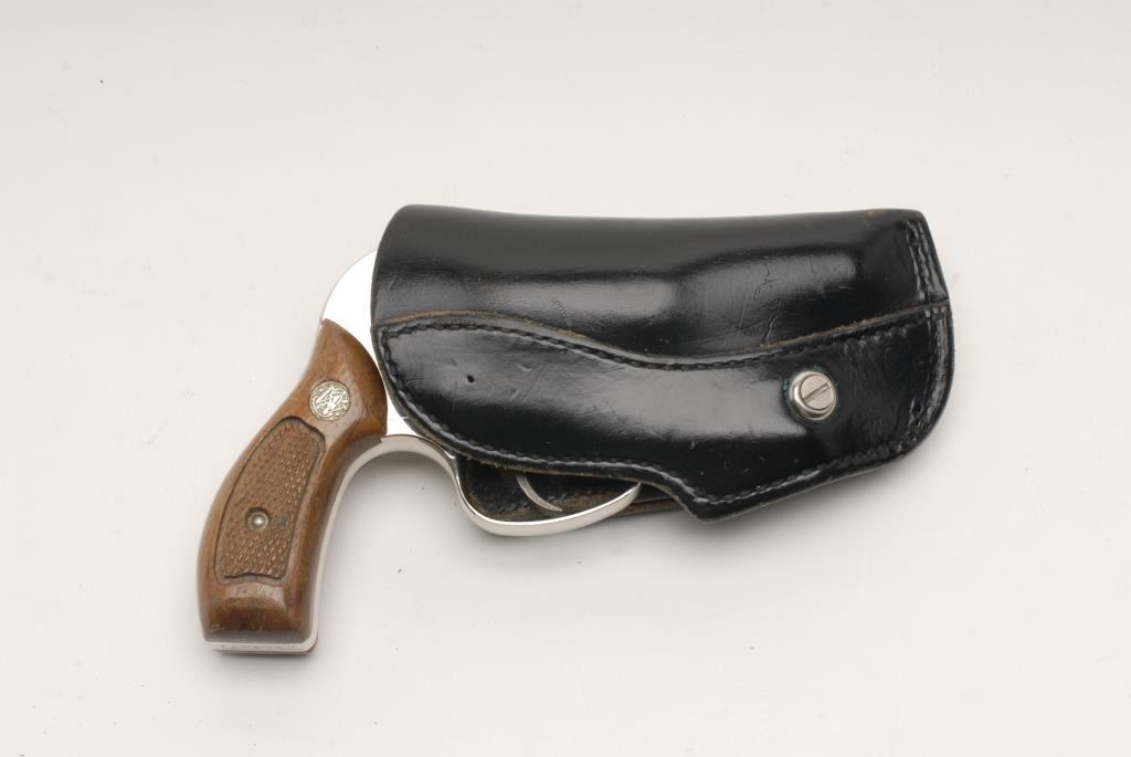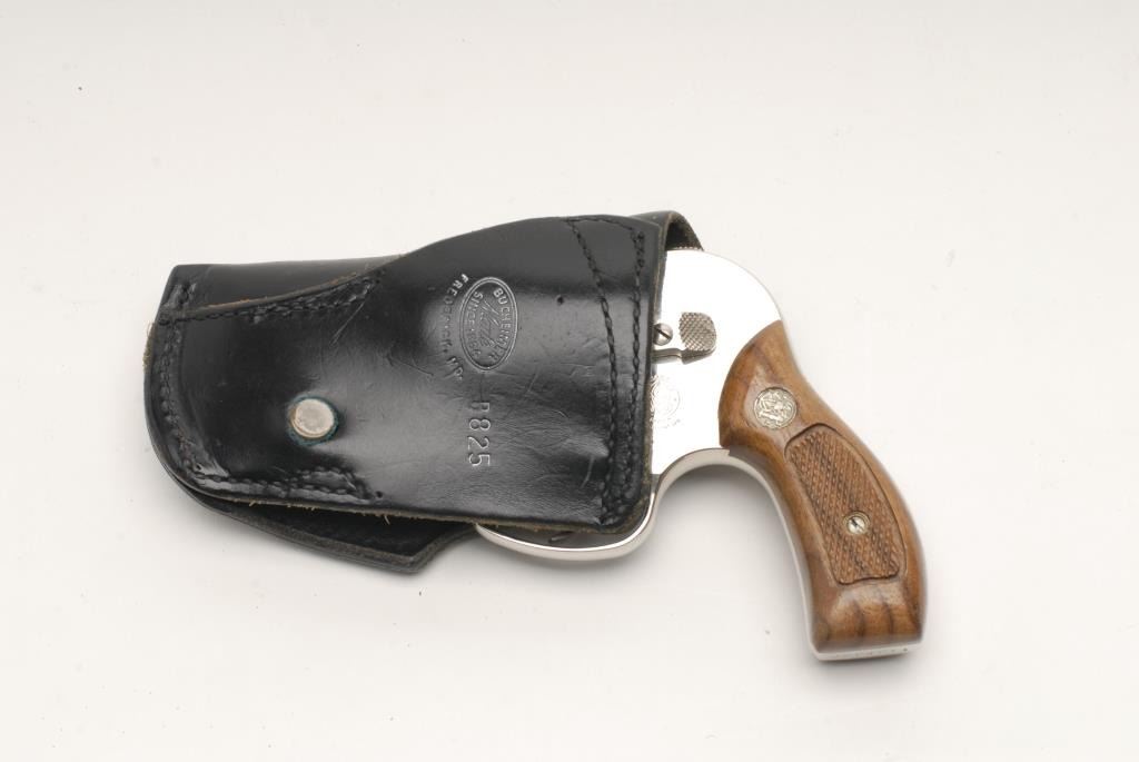 Smith & Wesson Model 38 Airweight DA revolver with shrouded hammer, .38 Special caliber, 2” barrel, S/N J364271, in overall fine condition with majority of factory nickel finish remaining, fine bore, crisp action, sharp markings and finecheckered wood medallion grips; accompanied by a Bucheimer leather belt holster. (Modern/PPT). Est.: $400-$800.