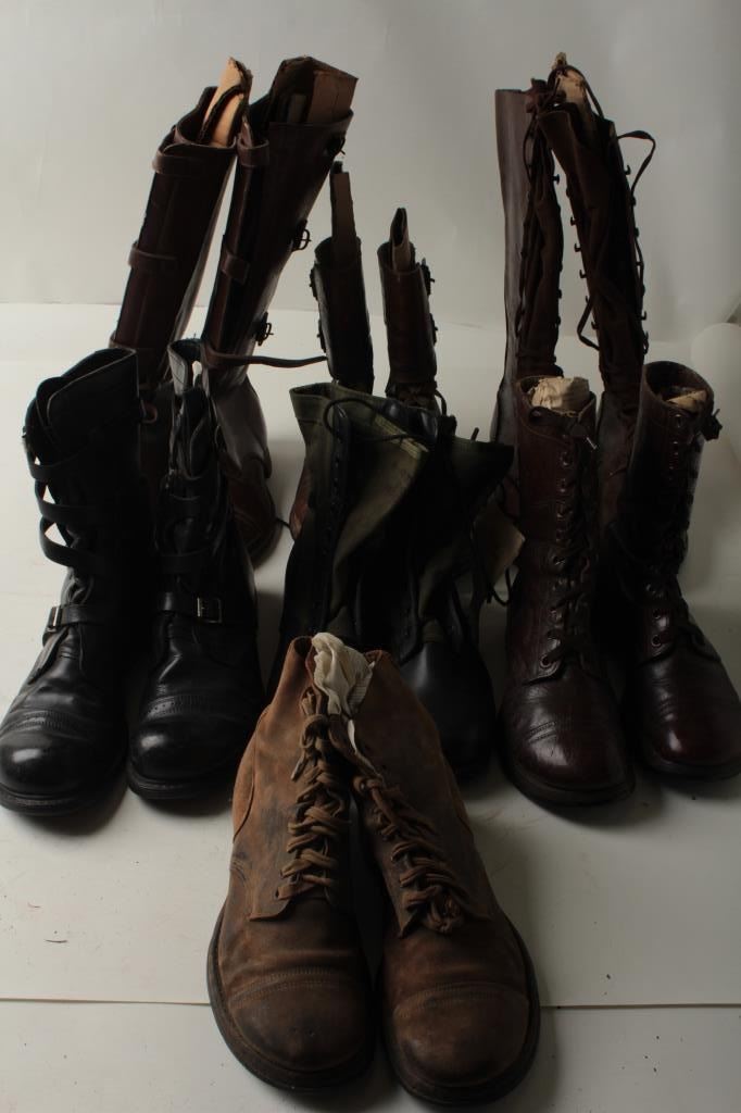 Lot of 9 pair of U.S. military boots spanning the eras of WW I to Vietnam; varying conditions. Est.: $250-$500.