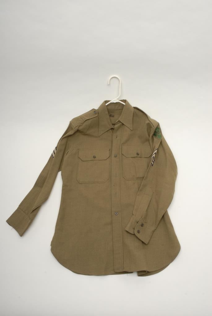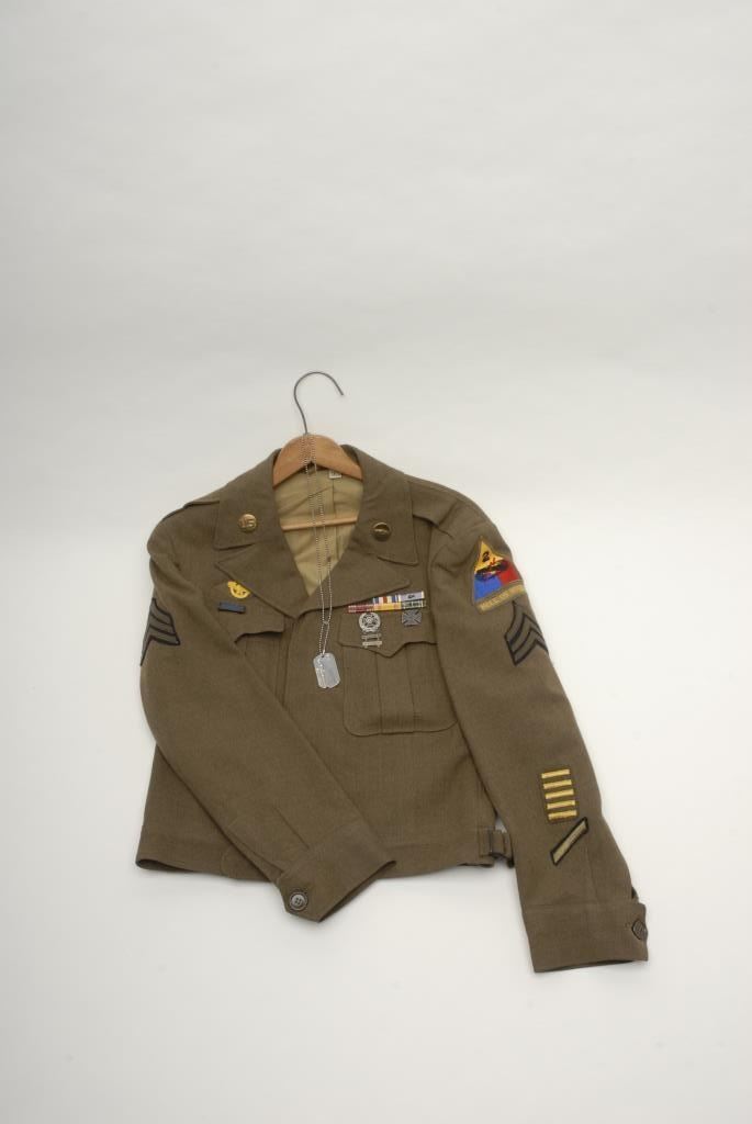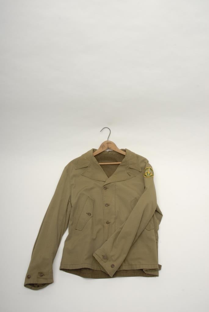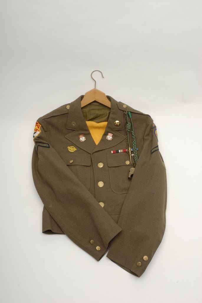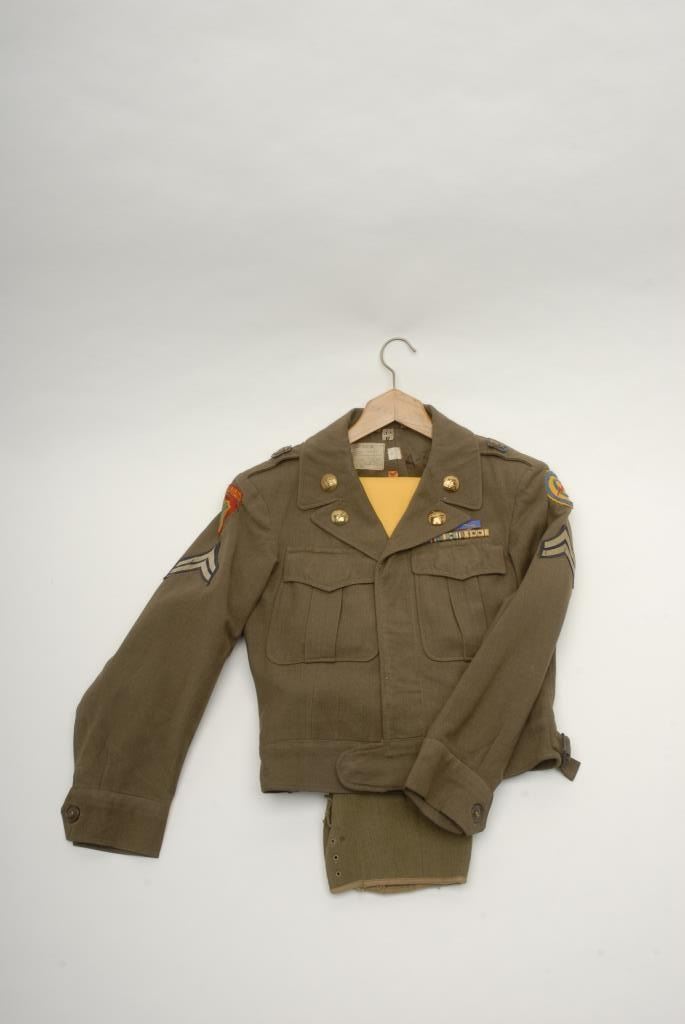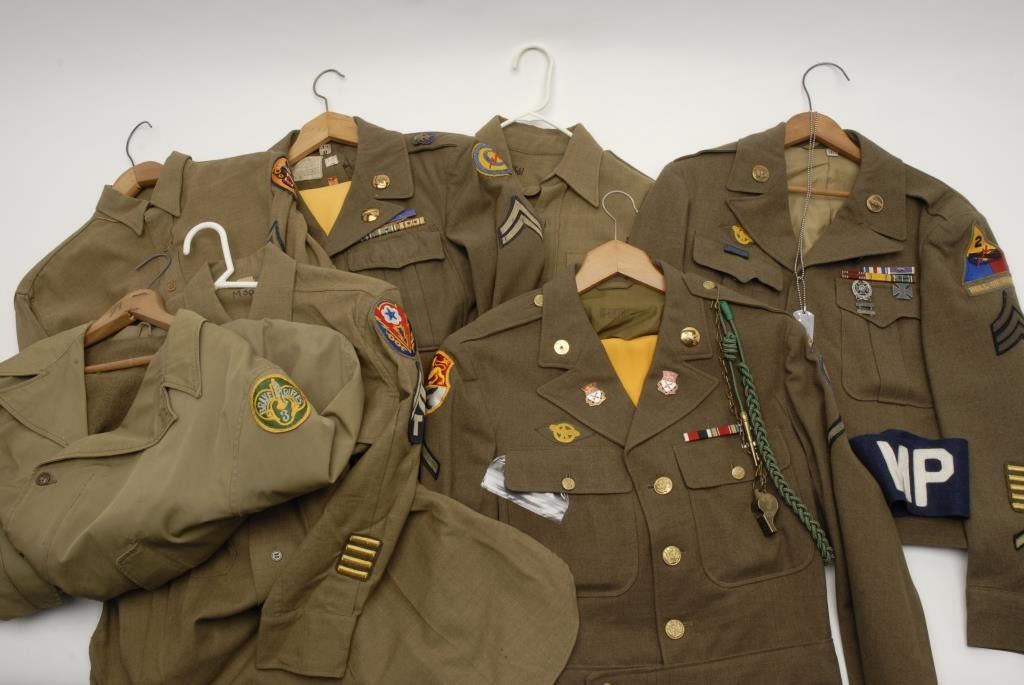 Lot 455 Lot of 7 WW II uniform pieces; 3 “Ike” jackets with insignia in good condition (1 has soldier’s do