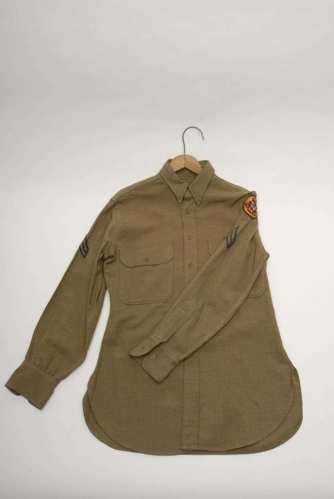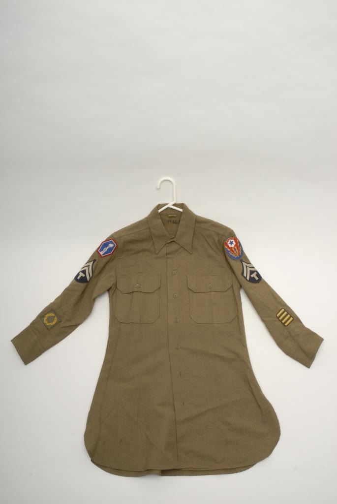 Lot of 7 WW II uniform pieces; 3 “Ike” jackets with insignia in good condition (1 has soldier’s dog tags); 3 shirts with insignia (1 with a few moth holes); 1 Model 1941 Field jacket in good condition. Est.: $400-$800.