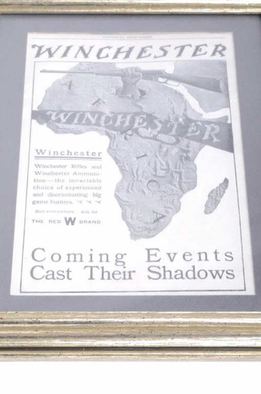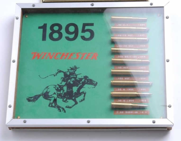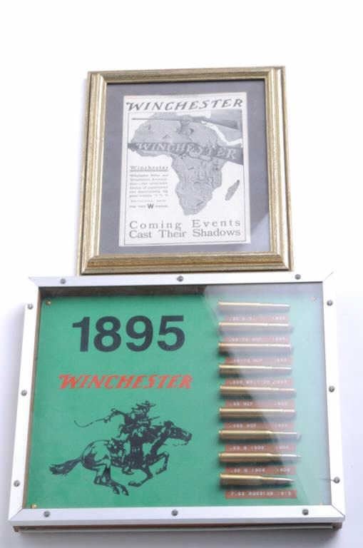 Lot of two Winchester display pieces highlighting the Model 1895. The first item is an old magazine ad from the National Sportsman portraying a gloved hand punching through a map of the continent of Africa. The gloved hand, reminiscent of T. Roosevelt, is gripping a Winchester 1895. The ad is matted and framed, in overall very good condition with some yellowing. The second item is a homemade cartridge display of the cartridges offered in the Winchester 1895. The display shows nine of the chambering options and is cased in an aluminum frame with a wood box. A great set for the 1895 Winchester shooter/collector. Est.: $200-$400.