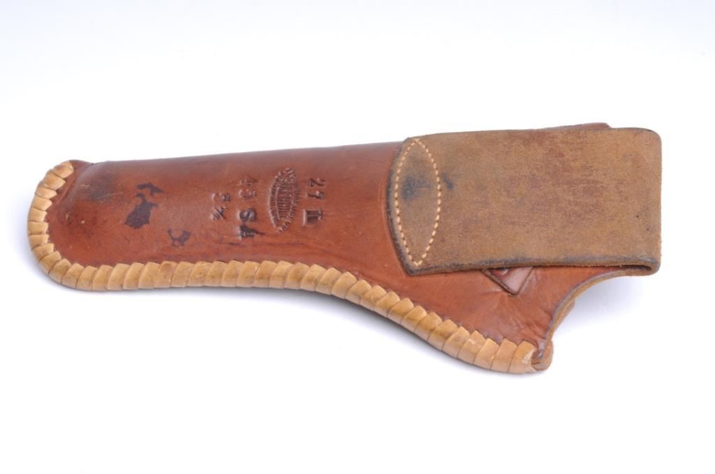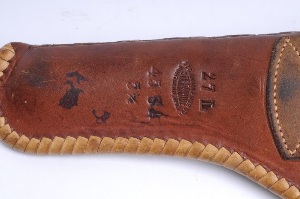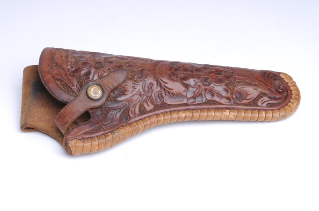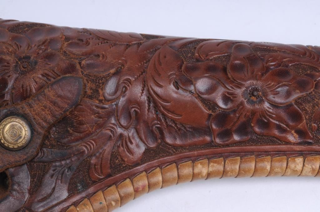 Lot 470a Carved leather holster by Lawrence for a 5 ½” Colt SAA in good condition showing use. Est.: $150-$
