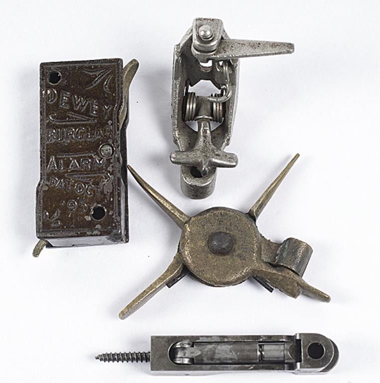Alarm Devices Lot of Four Lot of four small metal alarm devices, one marked Dewey Burglar Alarm Patent '95, one is marked but is now unreadable and 2, unmarked. Very good. Est:$200-400