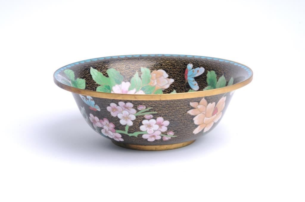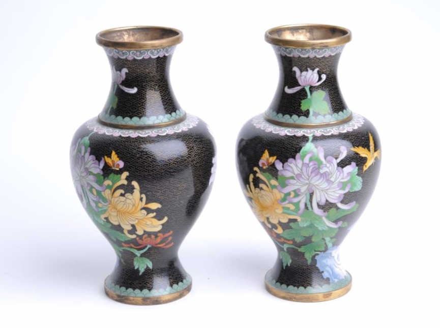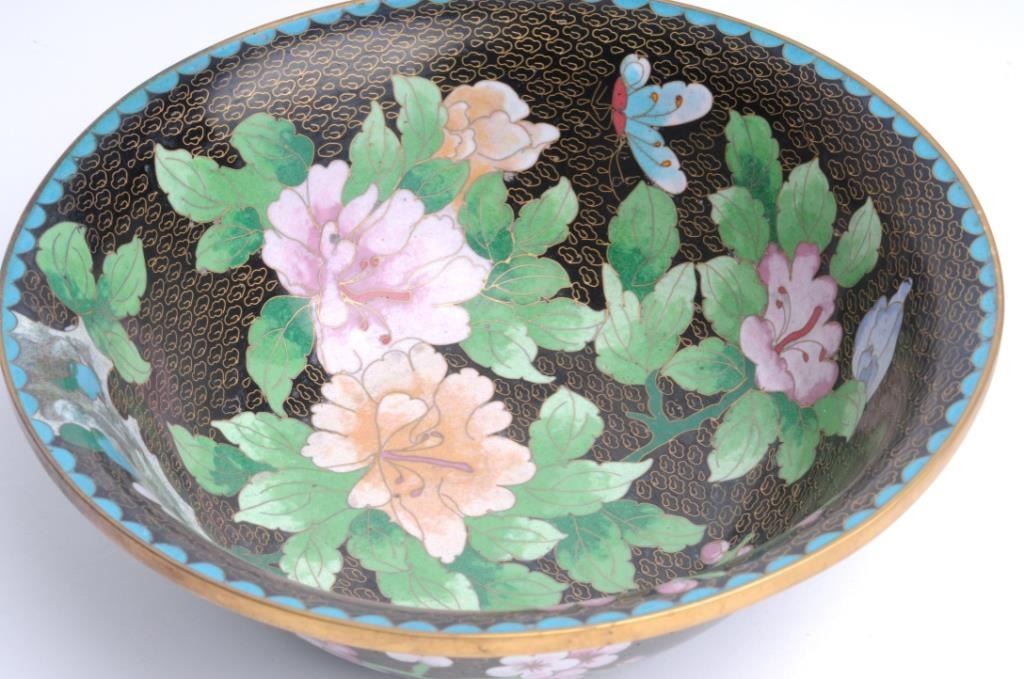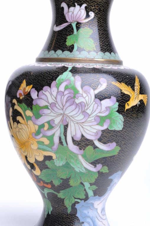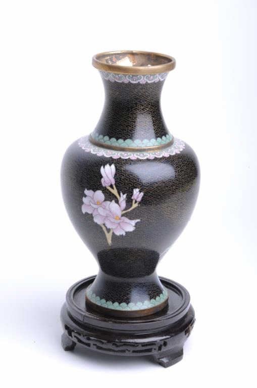 Three pieces of cloisonné including two vases, each approximately 12” in height with floral design against black background and a matching bowl, approximately 10” in diameter and 4” in height; accompanied by two wood stands for thevases. Est.: $200-$400.