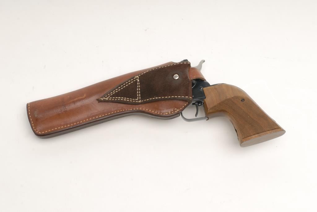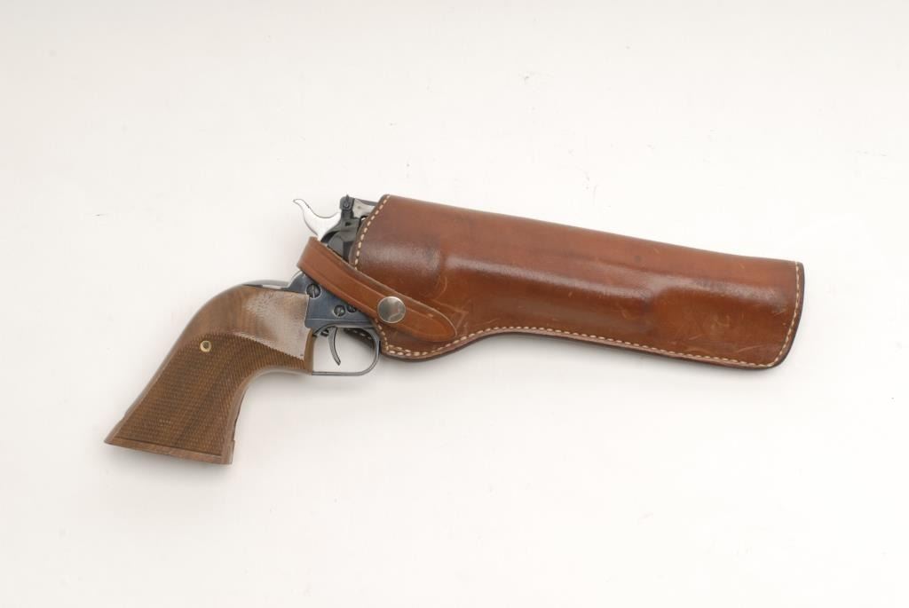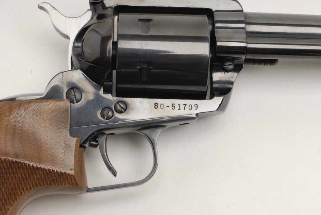 Ruger Super Blackhawk revolver, .44 Magnum cal., serial #80-51709. The pistol is in excellent overall condition showing little use. The barrel is 7 ½” in length and shows nearly all of its deep, polished blue finish. The pistol features a ramp front and adjustable rear sights. The cylinder shows little to no drag line, with only minor losses of finish on the back strap noted. The oversized, Herrett target grips are in very good overall condition with sharp checkering andsmall mars from use. The bore is excellent, the action crisp and markings are sharp on this desirable Ruger. The lot includes a leather, Bianchi snap holster. Est.: $400-$800. (Modern).