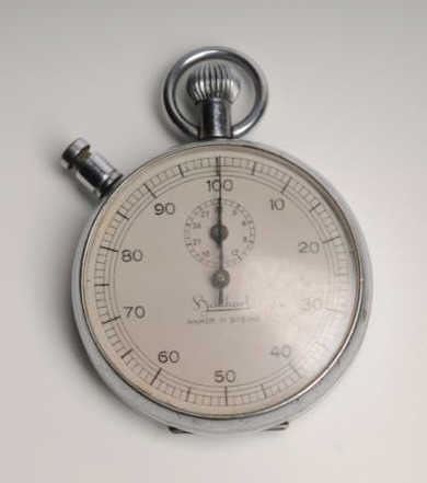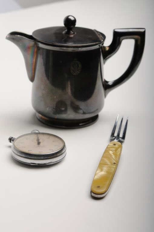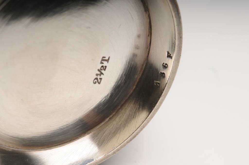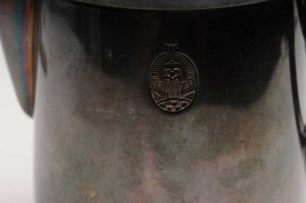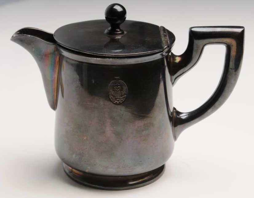 Sterling Silver creamer for teas service, #136F, approximately 4” in height and 3” in diameter with 2-1/2T stamp on bottom and a hallmark on the left side of the creamer; in overall very good to fine un-cleaned condition. Accompanied by a paperwork file and handwritten notes from our consignor that in summary, state the following: This creamer was “liberated” from Hitler’s villa in Bergeatesgarten, Bavaria by my uncle, Sgt. L.G. Smith in 1945, while with General Patch’s Army(Co. B 99th Heavy Mortar Battalion, 7th Army). Interestingly, one of the handwritten notes includes the uncle’s “C.O. told him if he wanted anything out of the ‘Berghoff’ mountain house or home, that he better get it because other U.S.units were right behind them. He got a complete sterling silver teas service which incuded my creamer, sugar bowl, silver ware, punch bowl & tray to put it on. He broke the set up and gave it to his kinfolks & friends” with the creamer going to my mother. Also included in the paperwork are photocopies of pictures of Sgt. Smith with various other soldiers. Also included is a misc. stopwatch and a folding pocket fork. Est.: $500-$5,000?