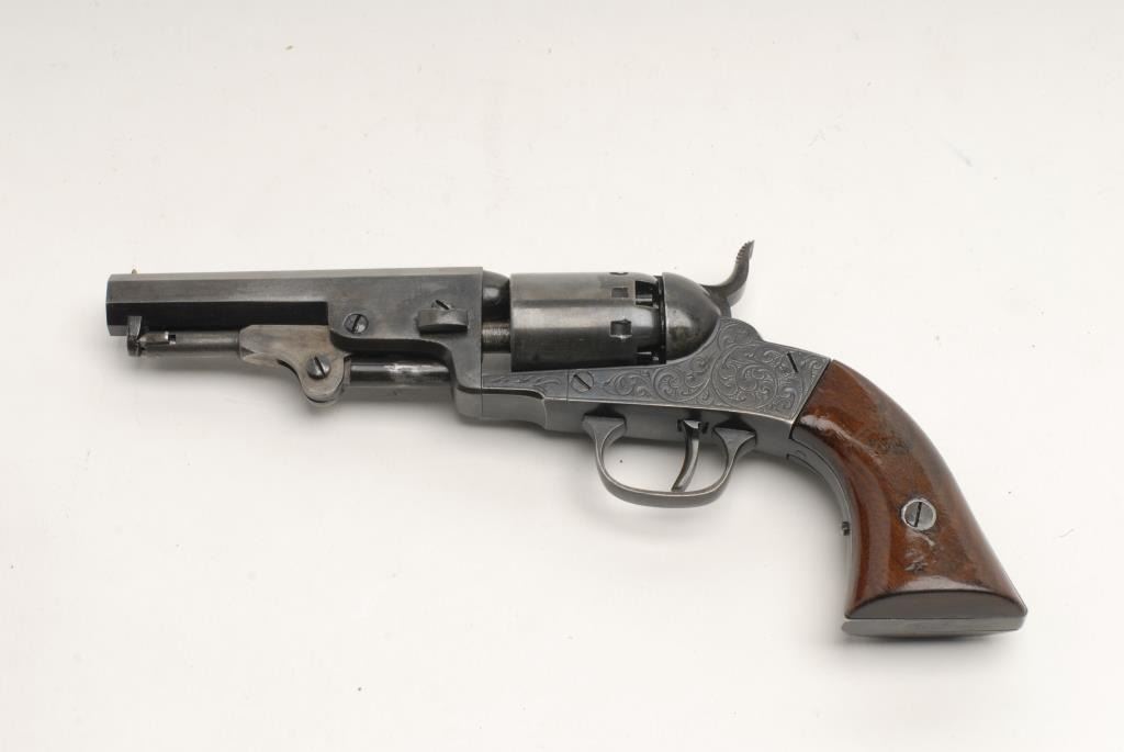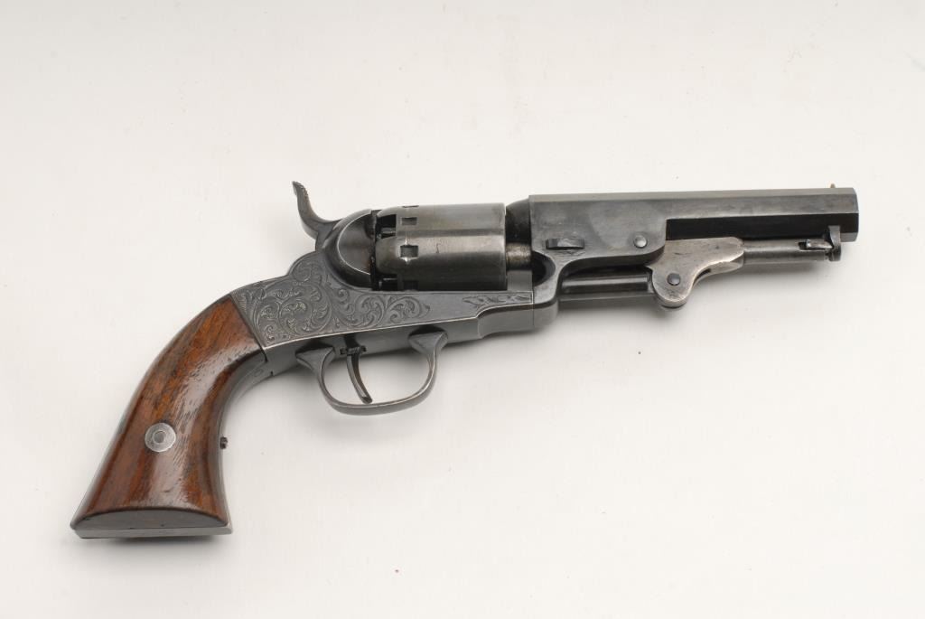 Engraved Manhattan Pocket Model percussion revolver, .31 caliber, 4”octagon barrel, S/N 235 with rare variation of unengraved cylinder and only five stop slots (noted in Flayderman’s Guide to Antique American Firearms (5C-007) as rare with all 3 known examples being under serial #500). This gun is in overall very good to fine condition with the majority of its original finish remaining, crisp action, sharp markings and fine grips. Accompanied by a note from the consignorgiving his additional opinion on the rarity of this Series I Manhattan variation. (Antique). Est.: $1,000-$2,000.