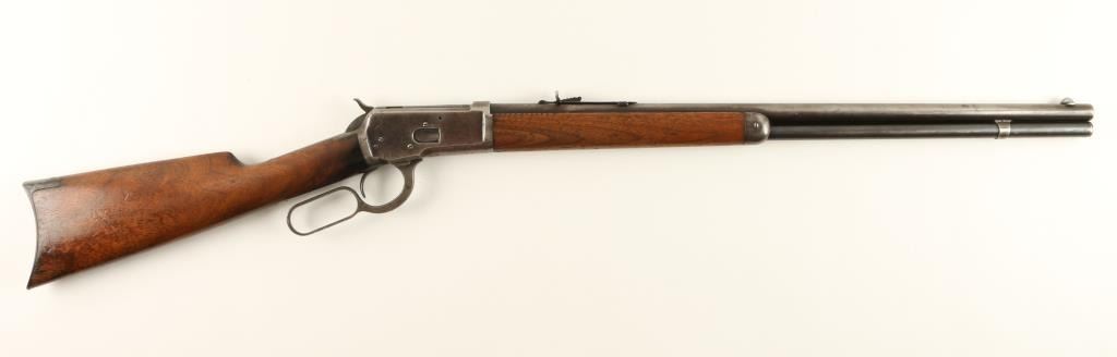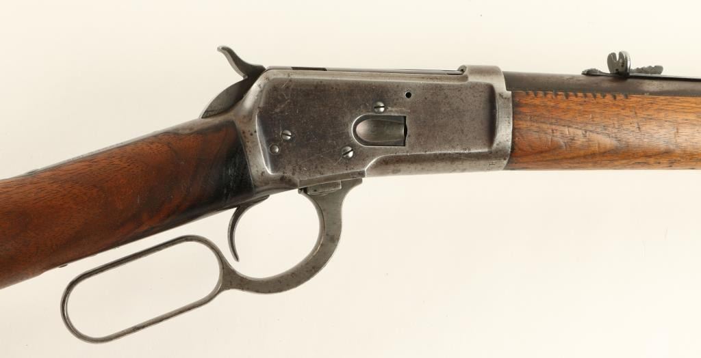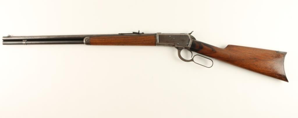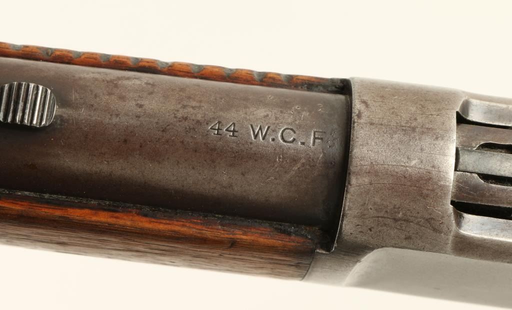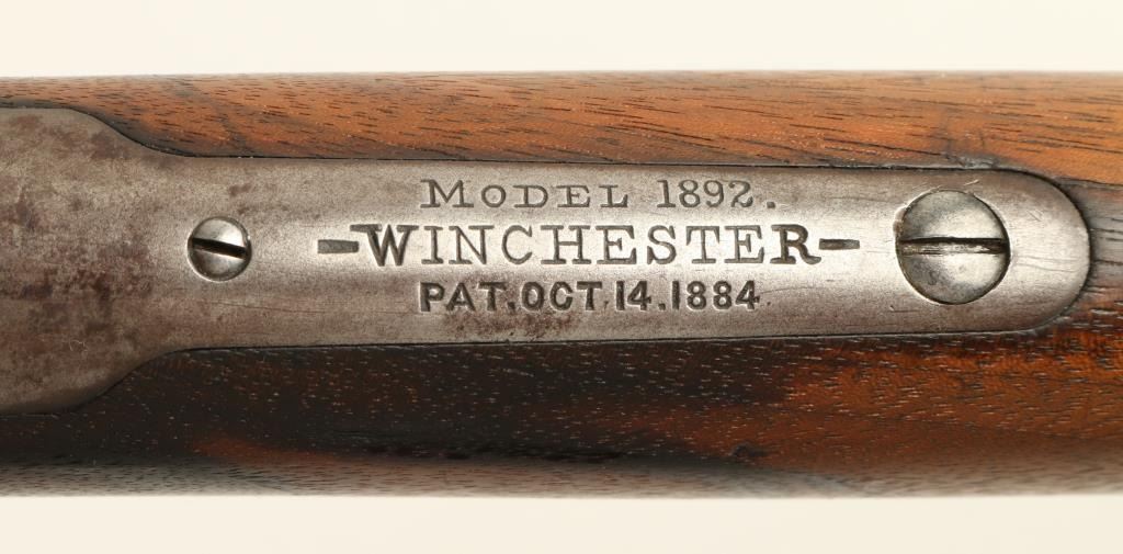 Winchester Model 1892 lever action rifle, .44 W.C.F. caliber, 24” round barrel, S/N 193586, blued finish, wood stocks in overall very good condition with considerable original blue on the loading tube and traces of the same on the barreland frame in protected areas; crisp action, very good bore, good markings and overall good to very good wood with small “kill” marks on the right side of the forend and an area of oil staining on the left side of the butt stock at the wrist.(C&R). Est.: $1,000-$2,000.
