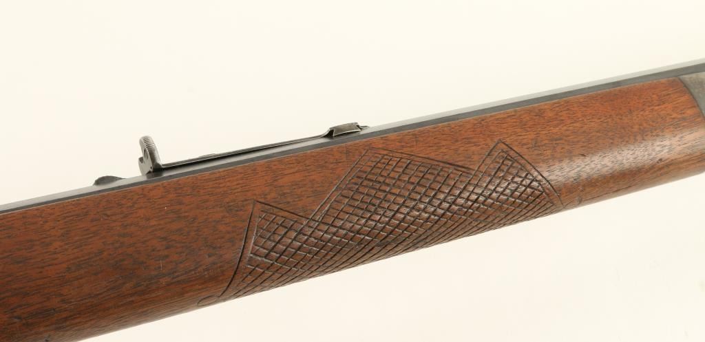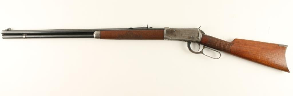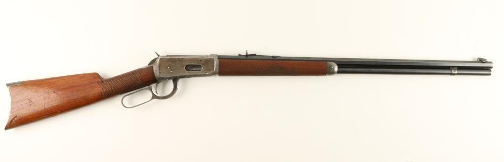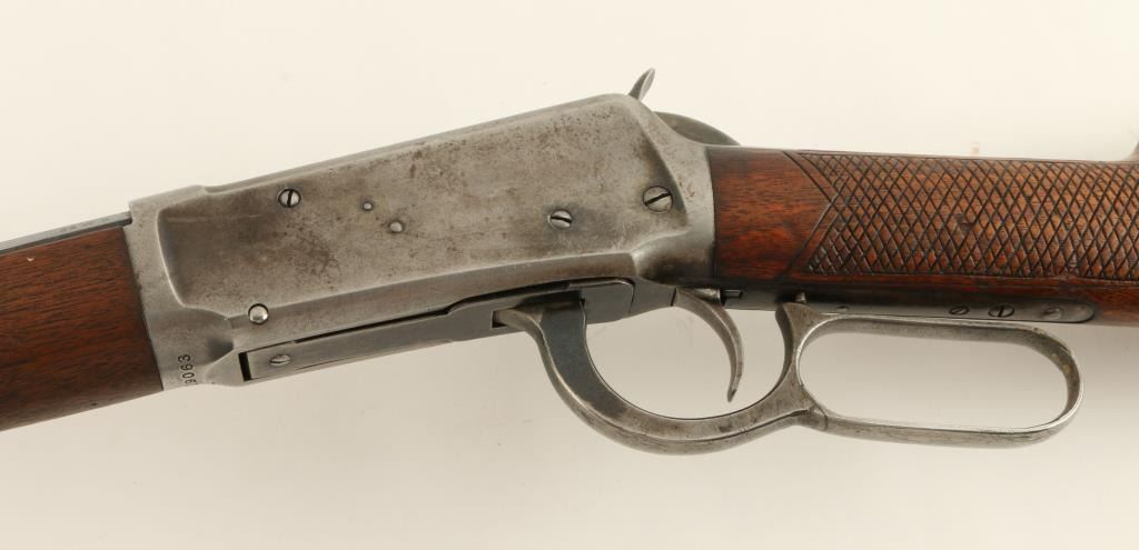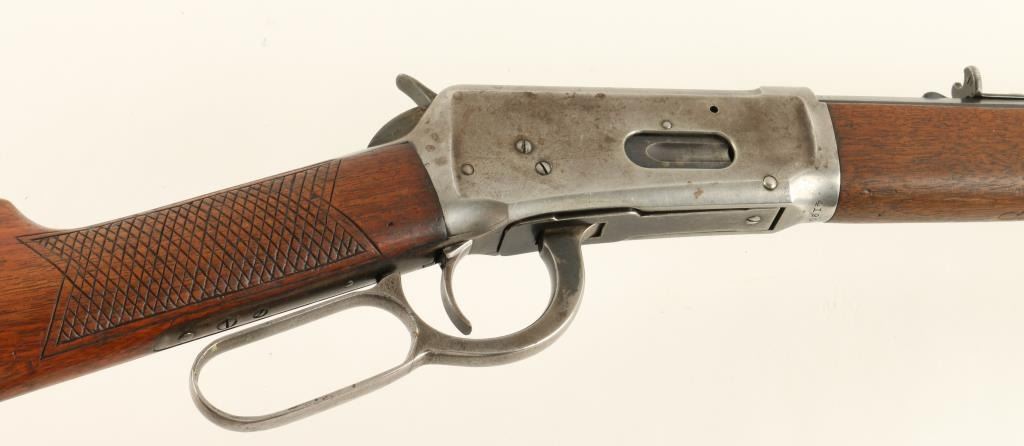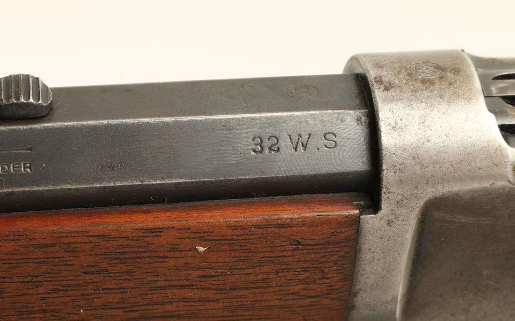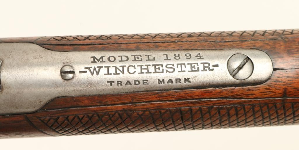 Winchester Model 1894 lever action rifle,.32 W.S. caliber, 26” octagon barrel, S/N 419063, blued finish, wood stocks with aftermarket hand checkering in overall good to very good condition displaying considerable original blue on thebarrel assembly, grey patina to receiver, crisp action and markings, fair to good bore, good wood stocks as personalized years ago; front sight blade is a replacement. (C&R). Est.: $700-$1,400.