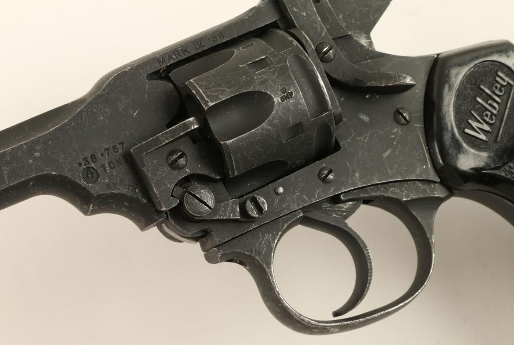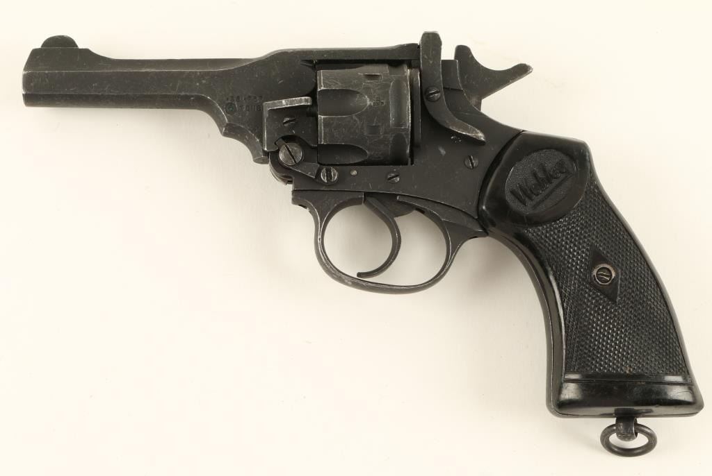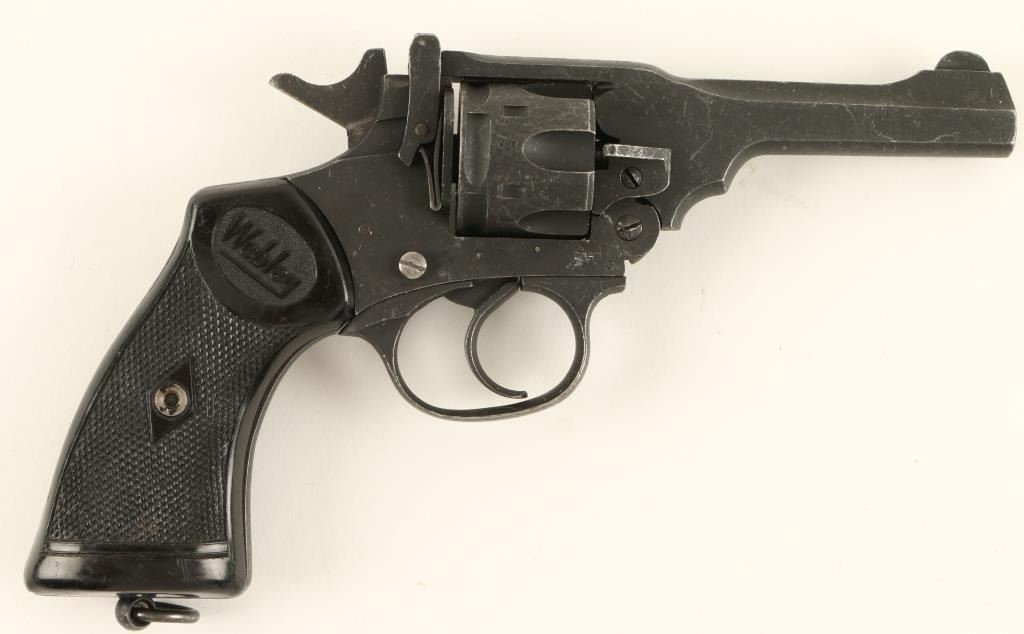 Webley MK IV DA revolver, .38 caliber, 4” barrel, S/N 53833, mat black finish, checkered black hard rubber grips, lanyard ring in overall very good + condition displaying the majority of original finish, crisp action, sharp markings, near finebore and very good grips. (C&R). Est.: $200-$400.