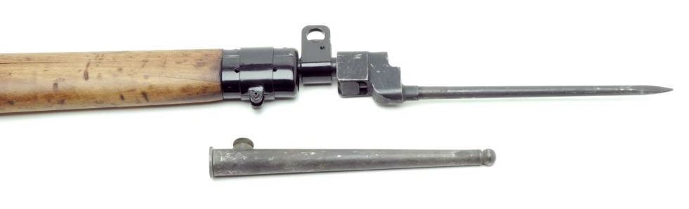 British Enfield No. 4 MK 1 bolt action rifle, import-marked, .303 British caliber, 25.5” barrel, S/N 49PF69718, black finish, wood stock with bayonet and metal sheath, in overall fair to good condition displaying strong rifling, a crispaction, good markings and overall good wood. (C&R). Est.: $150-$300.