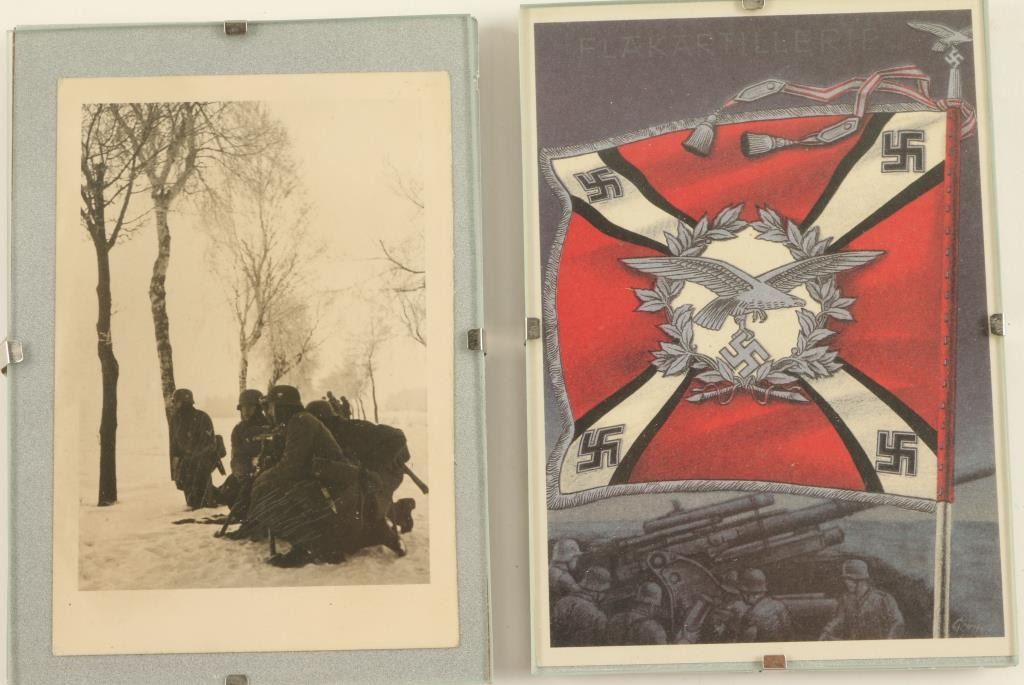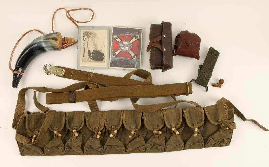 Misc. box lot of military gear and a modern powder horn; gear includes a Chinese marked olive colored ammo belt (empty); 2 misc. straps, 2 leather pouches; 2 framed German war postcards and a Krag rifle brass muzzle cover. Est.:$50-$100.
