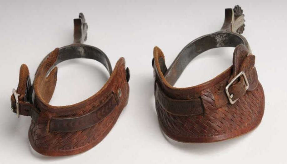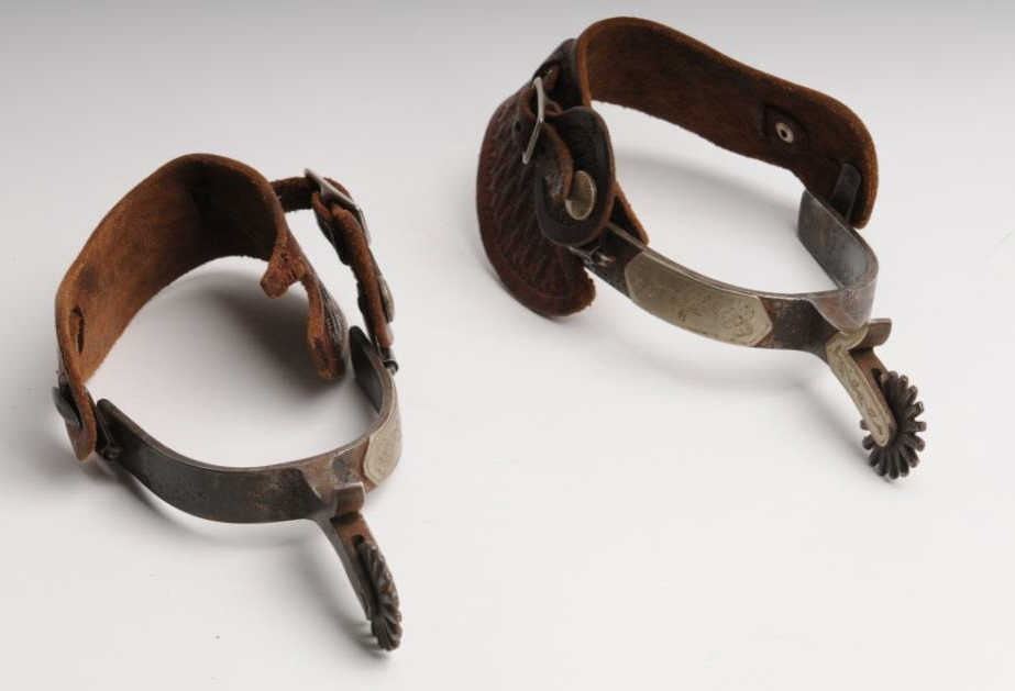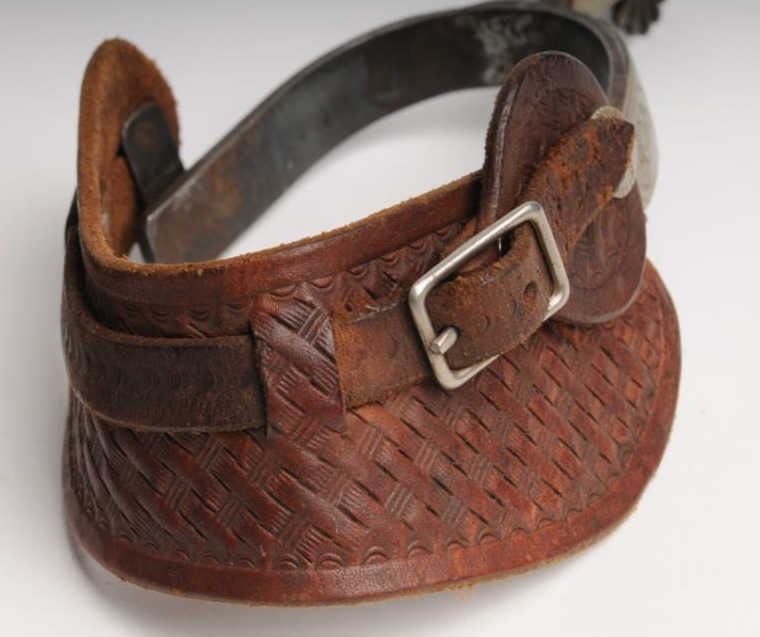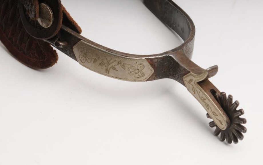 Pair of iron spurs with engraved overlay silver panels and basket weave leather straps in overall good condition. Est.: $100-$200.