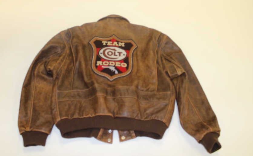Team Colt Rodeo leather jacket by Custom Clothing Co., size XL in overall good condition showing use but not abuse. Est.: $100-$200.