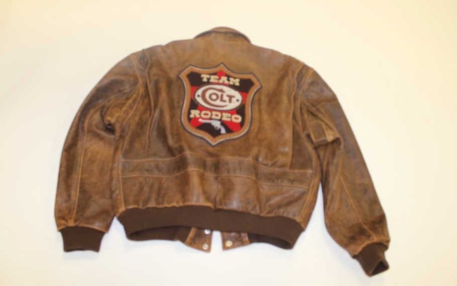 Lot 620 Team Colt Rodeo leather jacket by Custom Clothing Co., size XL in overall good condition showing us