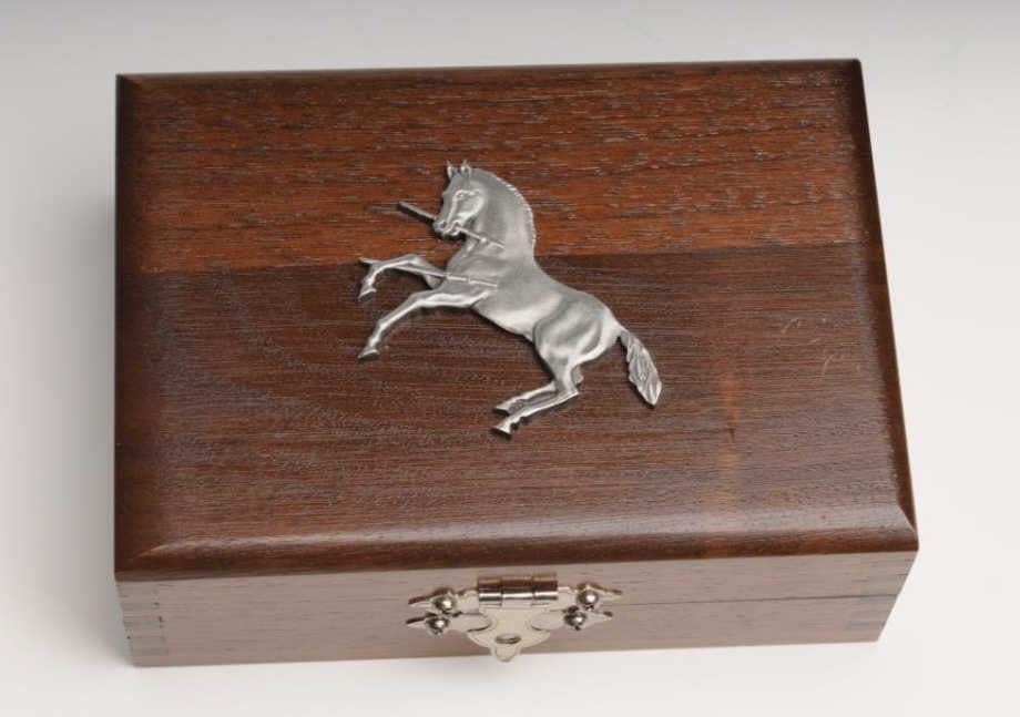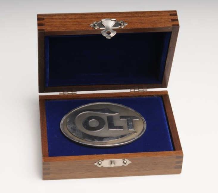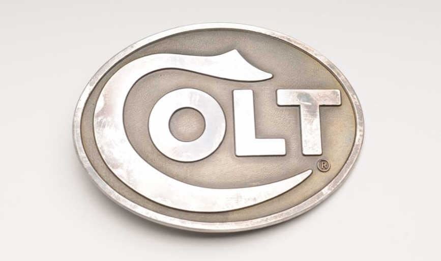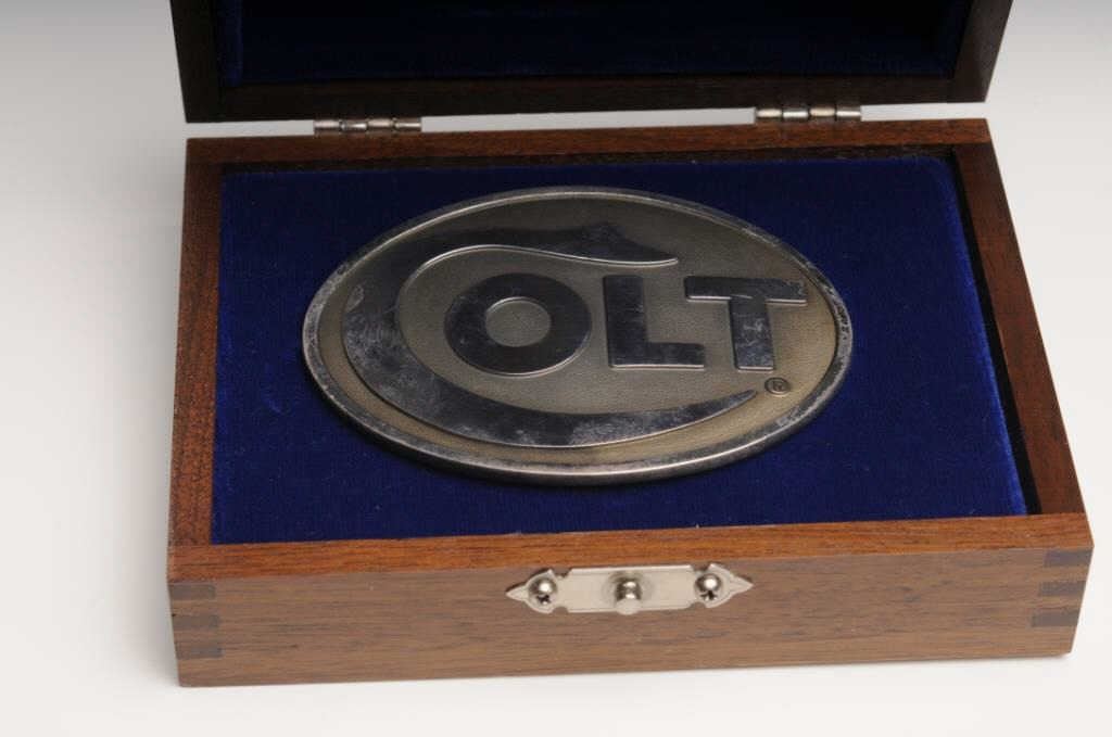 Silver Colt Belt Buckle, in limited edition number 1 of 1,000. The belt buckle is as new in the box. The buckle is marked .999 Silver 1 of 1,000 with the Rampant Colt emblem. The buckle comes in a wooden case with a metal Rampant Colt emblemembossed on the lid. A nice piece of Colt memorabilia and number one in the series. Est.: $150-$300.