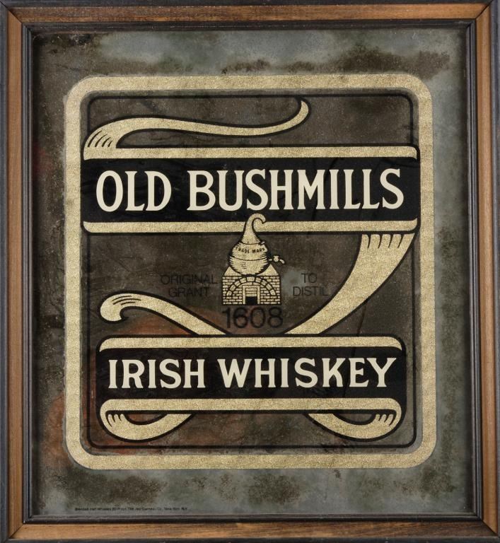 Lot 650a Framed distributor’s advertising mirror for Old Bushmills Irish Whiskey, approximately 25” x 22.5