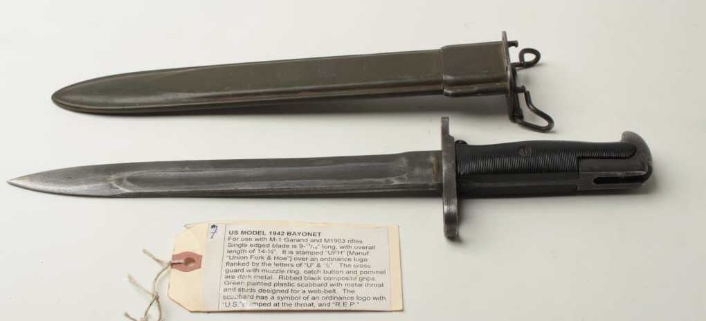 U.S. Model 1942 bayonet. Intended for use with the M1 Garand and Model 1903 rifles, the bayonet is in very good condition with a 9 13/16” blade and an overall length of 14 1/2 inches. The blade is stamped, “UFH” over an ordnance logo with “U”& “S” on each side. The blade shows the majority of its military finish with so signs of sharpening. The ribbed composite grips are in very good condition showing small mars and wear. The O.D. green plastic scabbard incorporates ametal throat with belt hangars. The scabbard has a flaming bomb ordnance logo stamped on the metal portion. Est.: $75-$150.