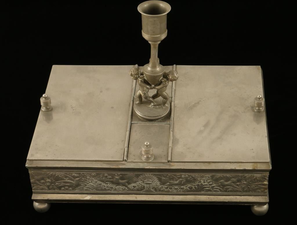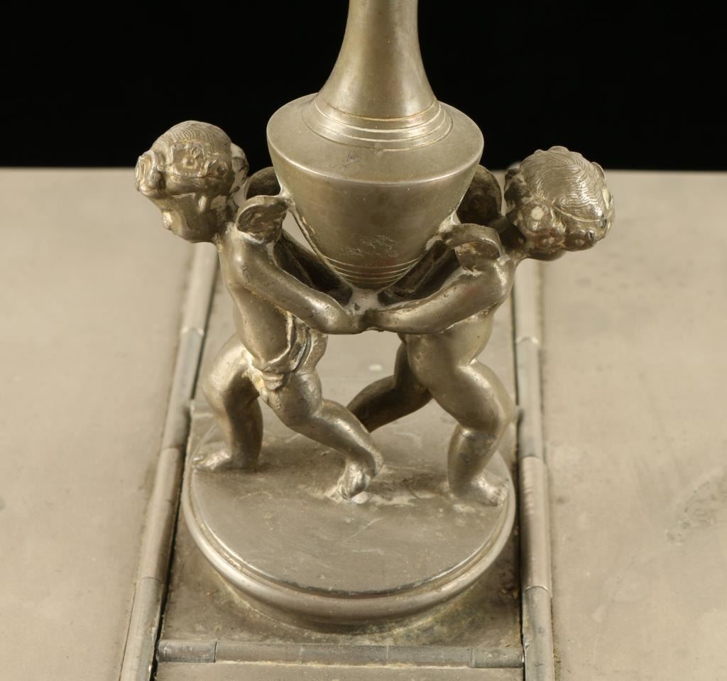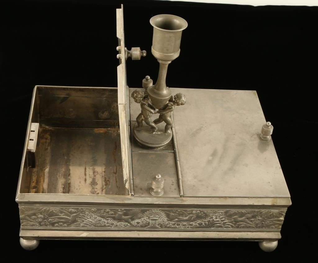 Beautiful metal cigar humidor with four compartments (two with key locks) and an ornate candle holder affixed to the top of the finely ornamented piece; approximately 11.5” x 8” x 3.5” overall. Key is missing but compartments areunlocked. Est.: $175-$350.
