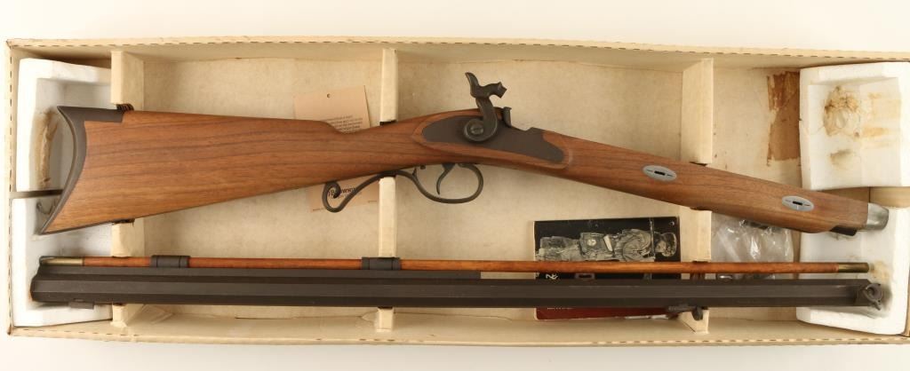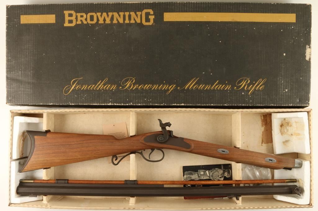 Scarce modern Jonathan Browning blackpowder percussion Mountain rifle, .54 caliber, 31” octagon barrel, 857PMO1668, browned finish, wood half stock, wood ramrod in like new un-assembled condition with instructions manual and in Browning factory cardboard box. An accompanying article from the Outdoor Channel notes that there were only about 150 of the .54 caliber guns with brown steel furniture manufactured. Est.: $600-$1,200.