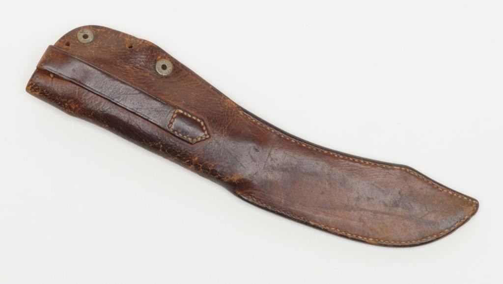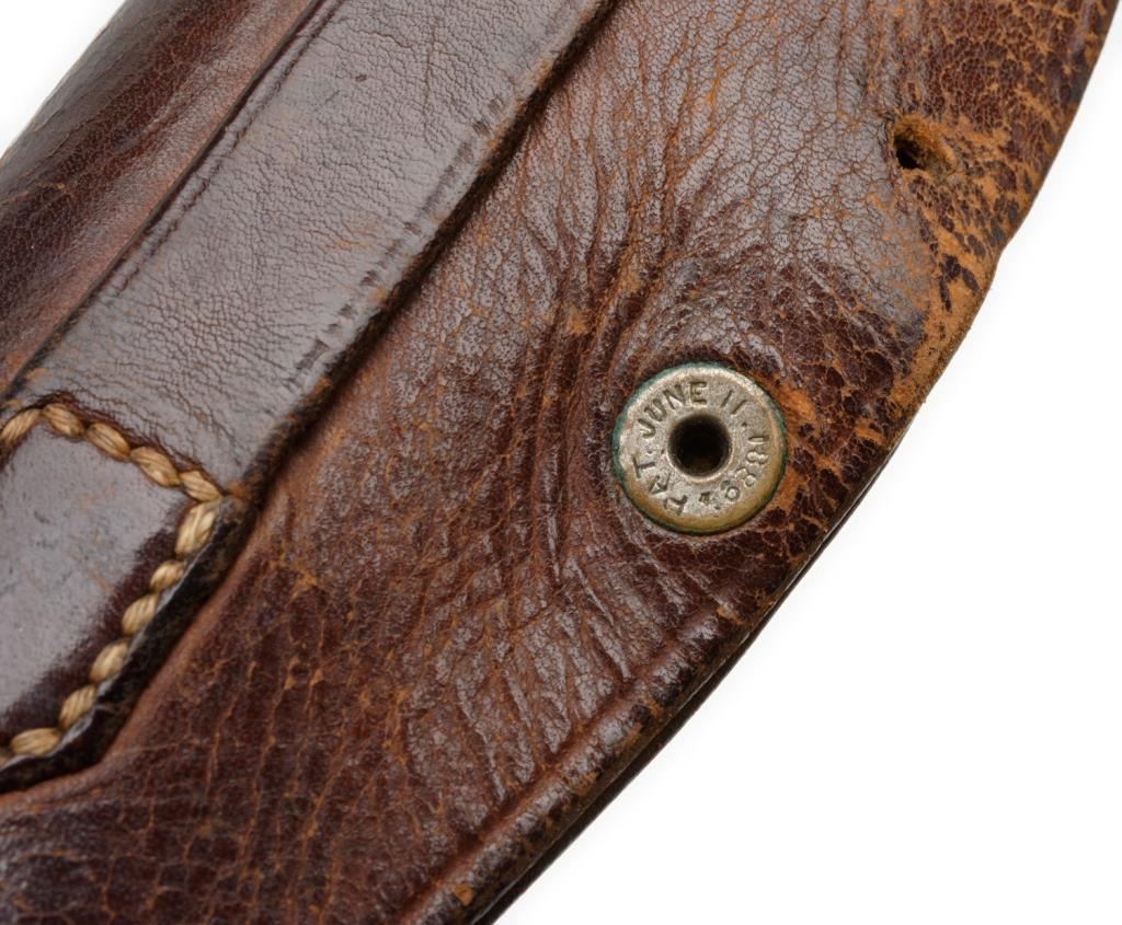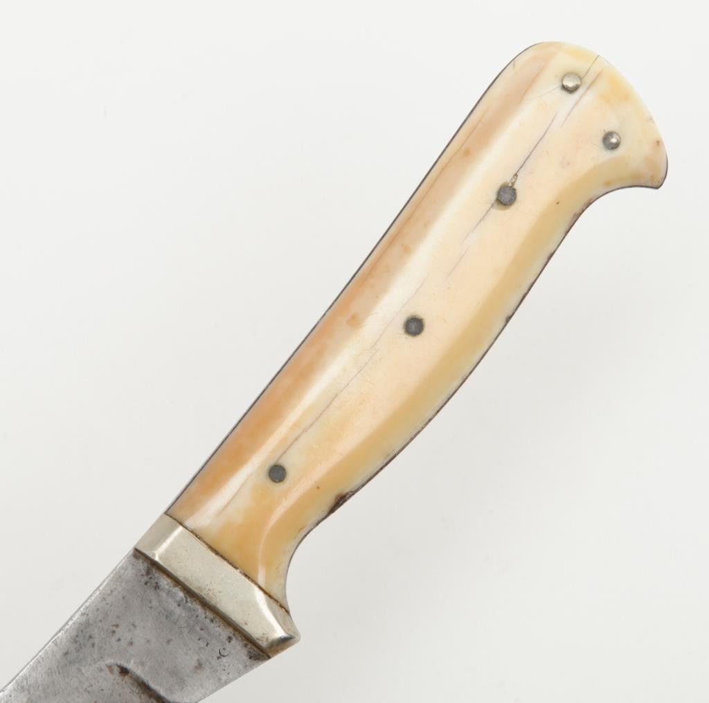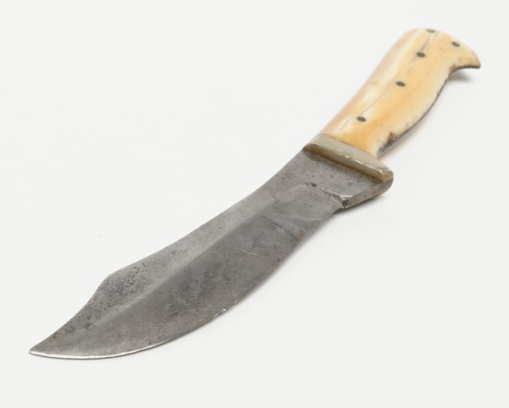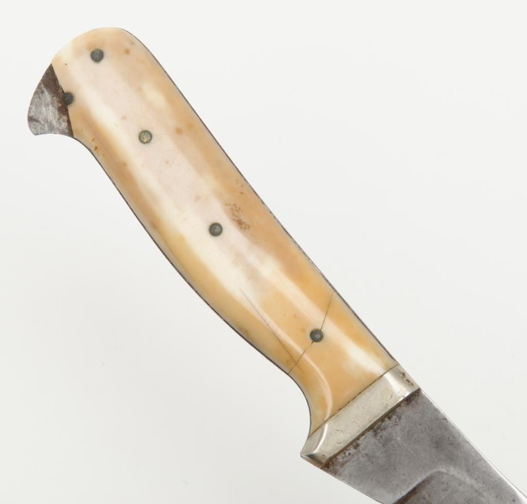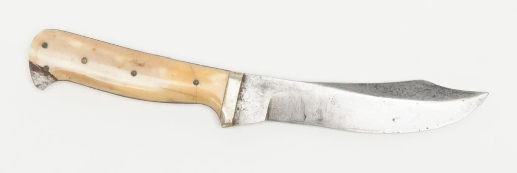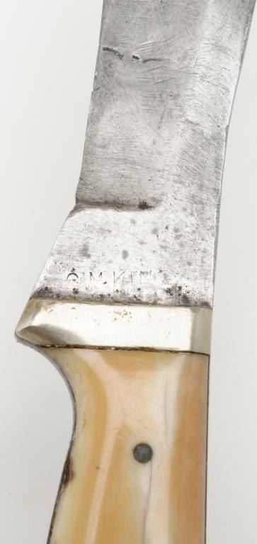Clip point curved blade knife, approximately 9” overall with a 5.25” blade marked “C.M. King” at ricasso with 5-pin marine ivory scales; simple German silver bolster in overall good condition with blade showing a grey patina, minor pitting;marking is faint; some scratching. The grip scales show a beautiful toning and age cracks with a small loss on the lower right rear scale. Accompanied by a brown leather sheath in overall good condition displaying some scuffing and two of three copper snaps remaining along with leather belt loop. Est.: $1,500-$3,000.