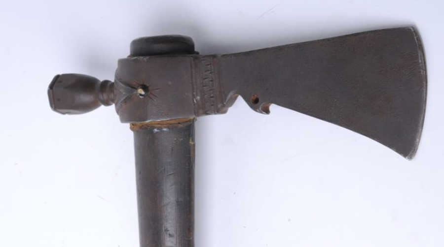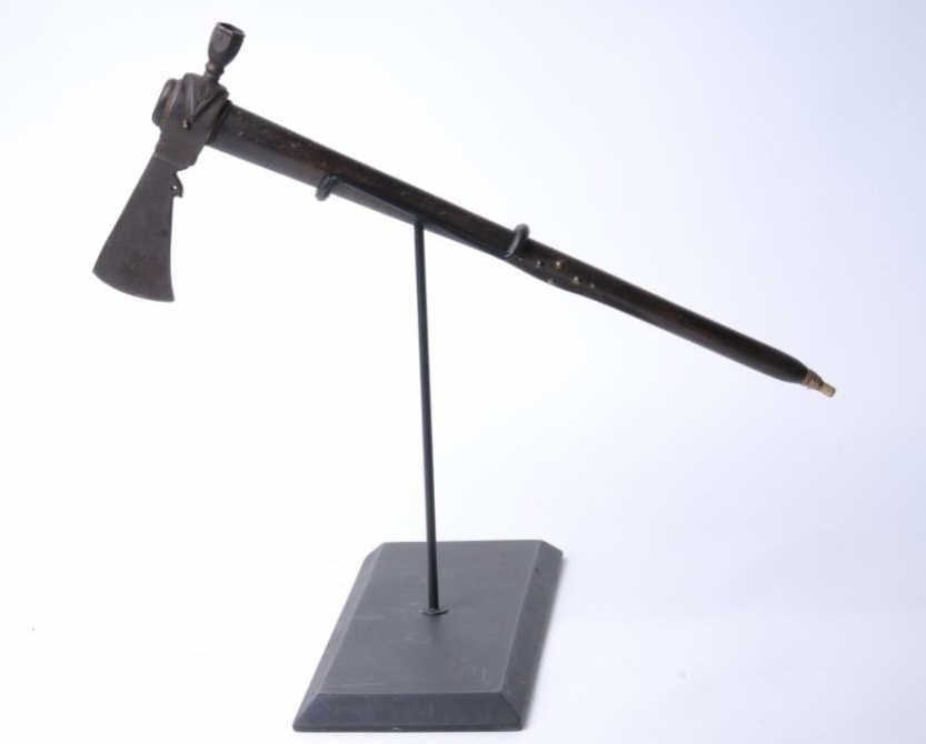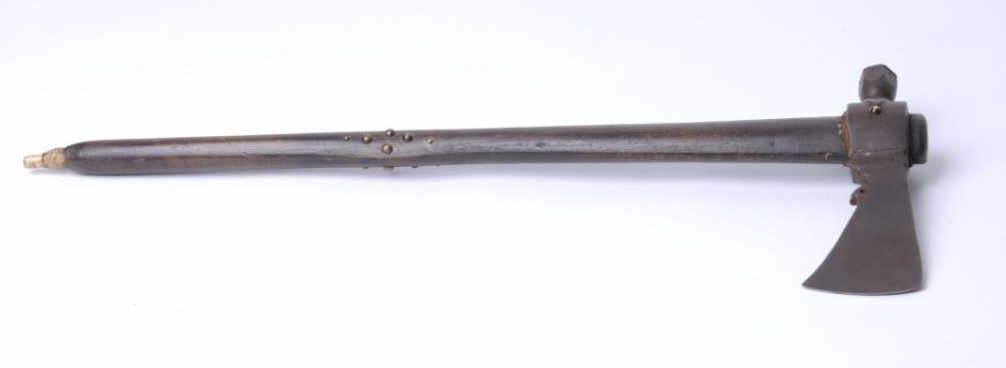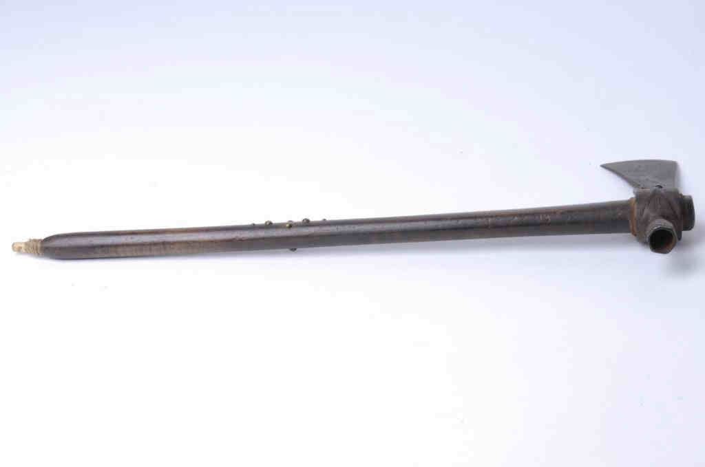 Lot 791a Early 19th century authentic pipe tomahawk with tacked shaft of proper era showing marine bone mou
