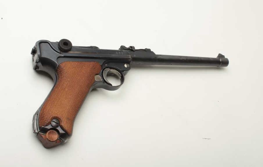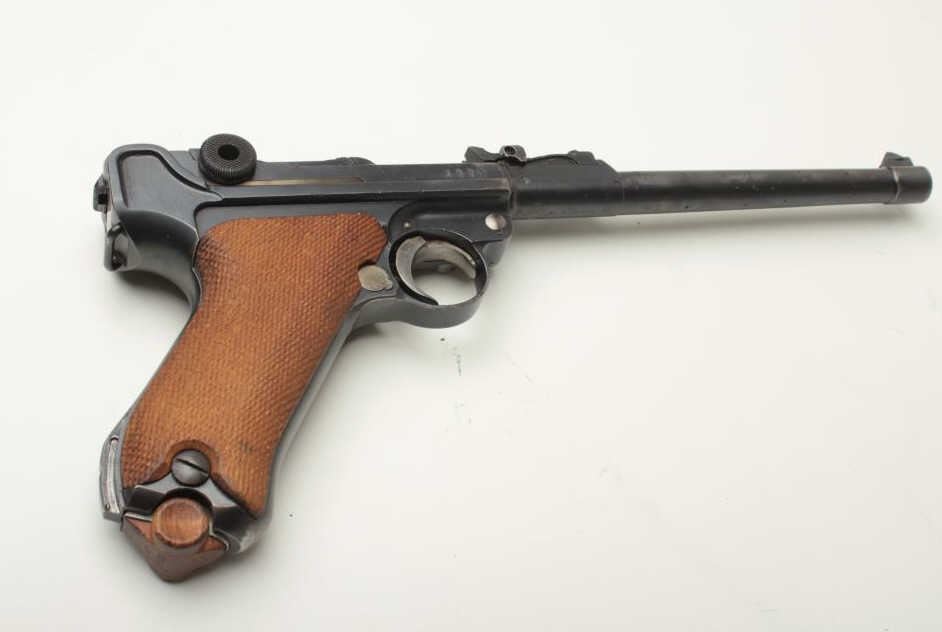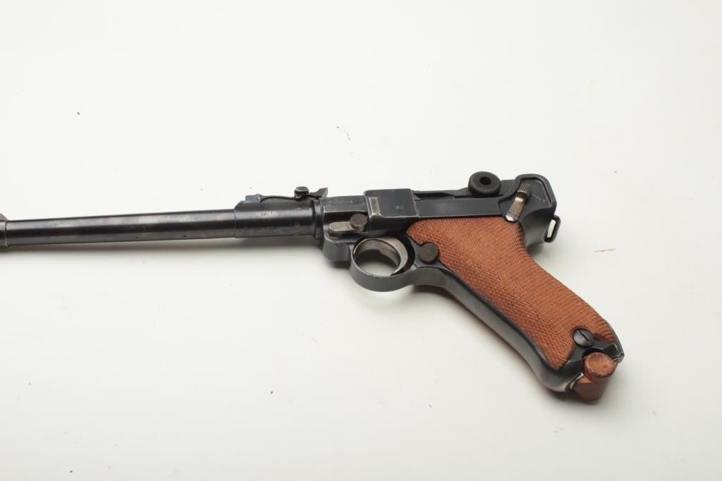 Artillery Luger by DWM semi-automatic pistol, 9mm caliber, 8” barrel, 1917 dated frame, S/N 8088g, all matching visible numbers including the magazine, British proofed, blued finish with straw finish to small parts, checkered wood grips, in overall good to very good condition showing an old re-finish with some scattered spots of pitting confined primarily to the barrel; very good to near fine bore, good action, crisp markings, very good to fine grips. (C&R/PPT). Est.: $2,000-$3,000.