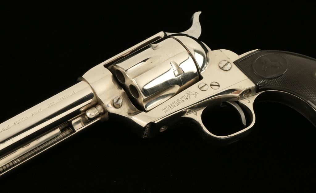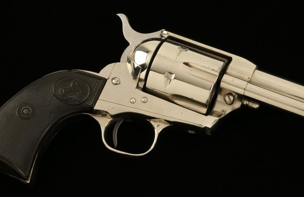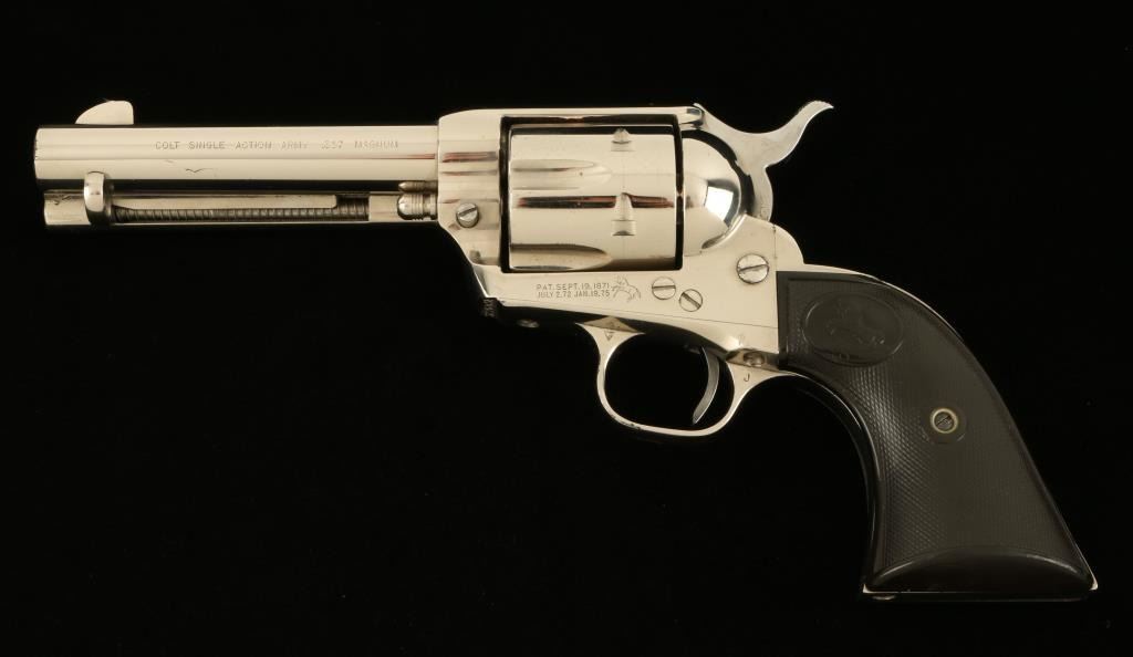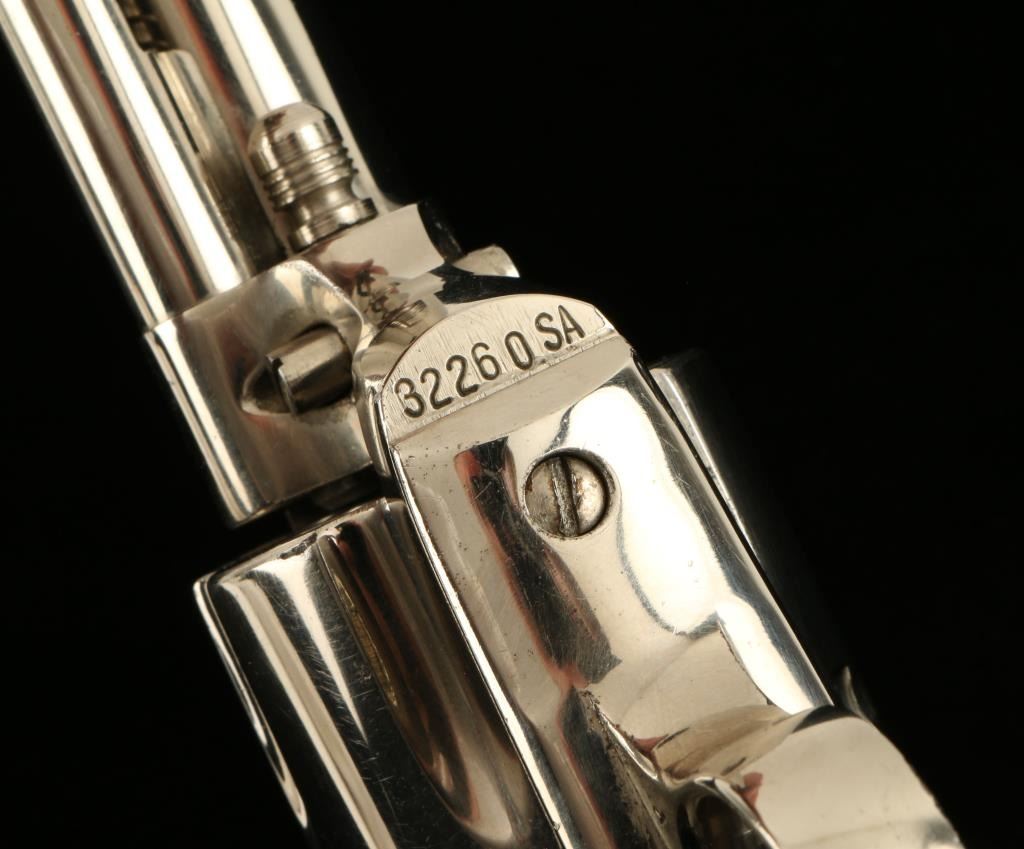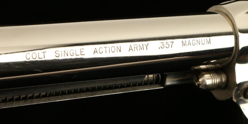 Colt SAA revolver, early (circa 1960) 2nd Generation, .357 Magnum caliber, 4.75” barrel, S/N 32260SA, nickel finish, checkered black hard rubber grips in overall fine condition showing little use and only minor handling. (C&R).Est.: $1,500-$3,000.