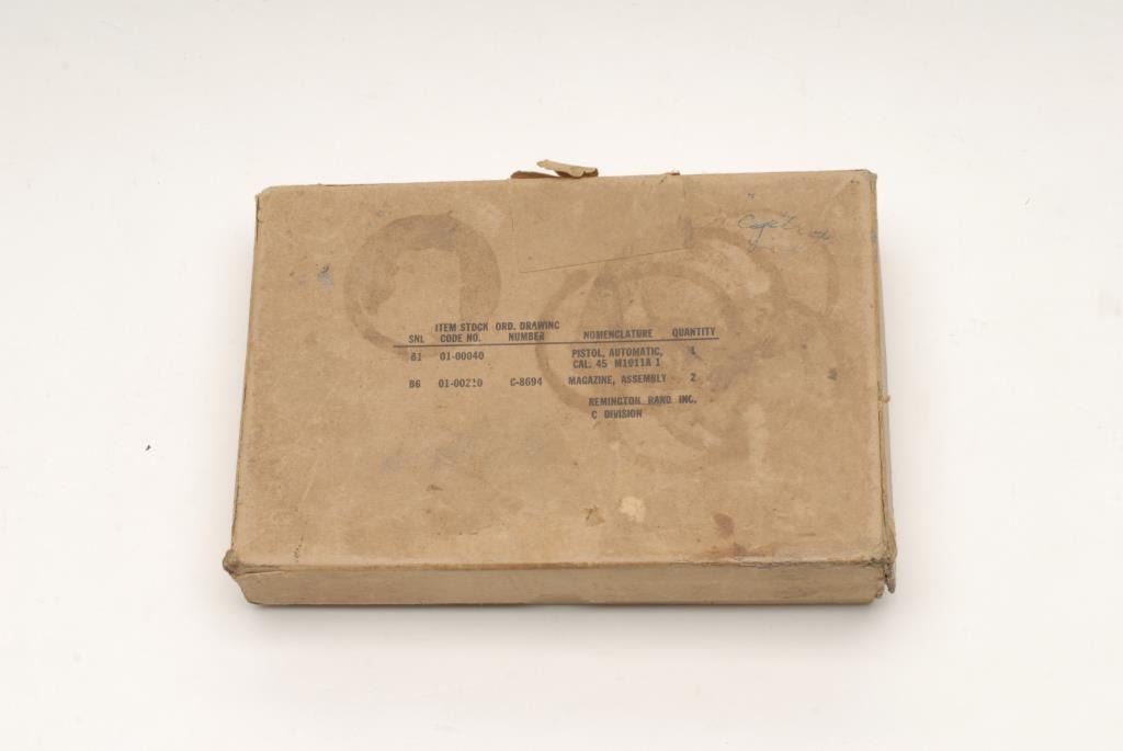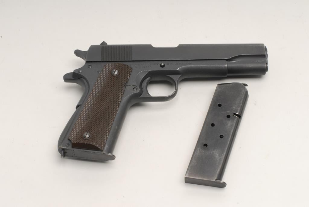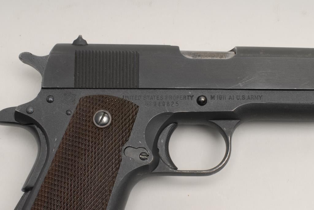 United States Property Model 1911-A1 semi-automatic pistol by Remington Rand, Inc., .45 caliber, 5” barrel, S/N 949625, in overall very good to fine condition displaying the majority of its mat finish with high point wear, “FJA”inspector’s initials, crossed cannons catouche, fine bore, crisp action, clear markings and fine plastic checkered Keyes Fibre grips. Accompanied by a “Kraft” two piece cardboard box with stenciled information on lid from Remington Rand;also accompanied by one extra magazine. (C&R). Est.: $3,000-$4,000.