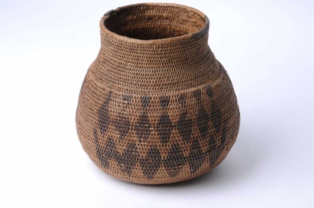 Exceptional woven Indian basket with lid approximately 9” in height; very good condition, ca. 1900-1920. Our consignor bought this many years ago as Hopi; we think it is Northern California; in any case, a large, early andwell-preserved basket. Est.: $1,000-$2,000+.