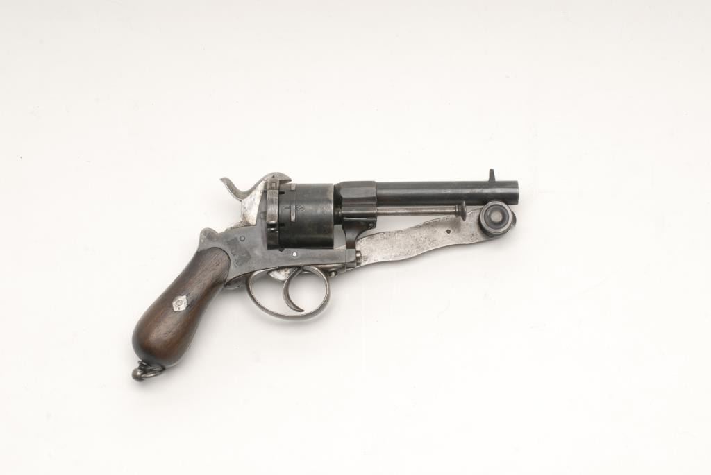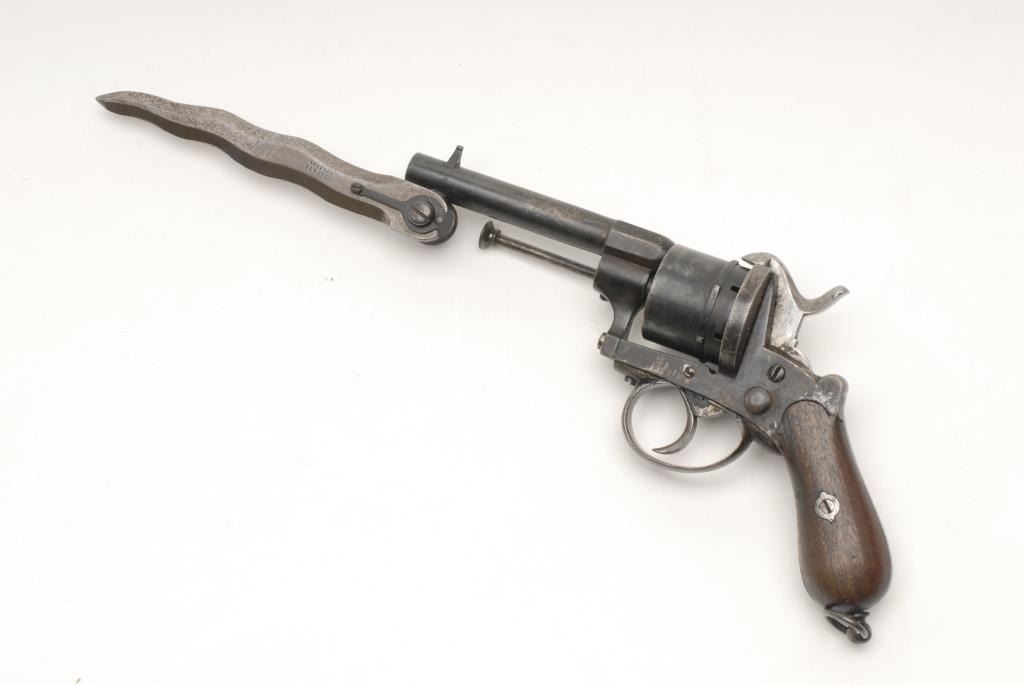 Lot 849 Belgian pinfire DA revolver with folding blade marked “DELHAXE SYSTEME”, 9mm caliber, 4.25” barrel