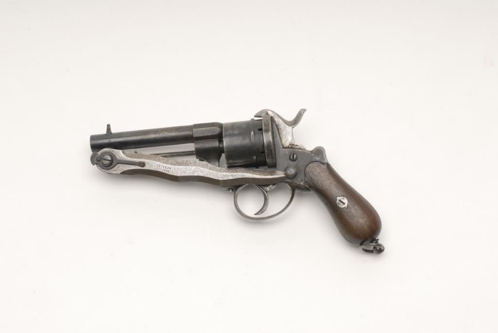 Belgian pinfire DA revolver with folding blade marked “DELHAXE SYSTEME”, 9mm caliber, 4.25” barrel, blued finish, wood grips with lanyard ring, no visible S/N, in overall good to very good condition displaying a mixture of mostly original blue finish and some brown patina; good action, very good wood grips. A popular European oddity gun from the 1870’s-80’s. (Antique). Est.: $1,000-$2,000.
