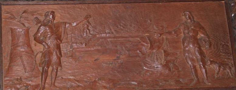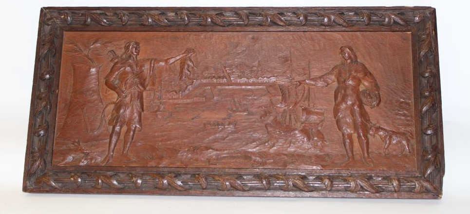 Lot 871 Carved in high relief Victorian wall plaque of settlers coming to America and meeting Native Amer