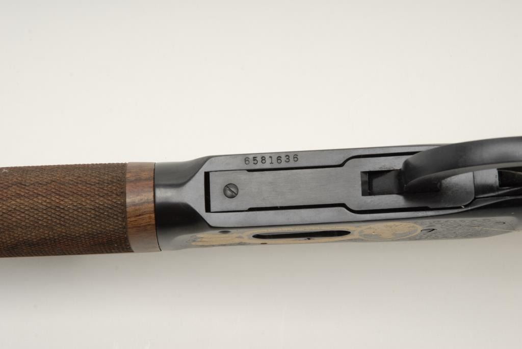 Winchester Model 94 TS John M. Browning 150th Anniversary Limited Edition lever action rifle, .44 Magnum cal., serial #6581636. The rifle is in as new in the box condition showing only handling and little to no use. The rifle has a 20” blued, octagon barrel and tang mounted safety. Limited to an edition of 150, this rifle features an engraved receiver with gold inlay depicting John M. Browning. The high grade checkered wood stocks show wonderful figure and are as new with a smooth, crescent metal butt plate. In the original factory box, sleeve and Winchester shipping box with all associated packing material. Manufactured in 2005, this rifle is one of a group that was the last rifles produced at the New Haven, CT plant that closed in 2006. Est.: $700-$1,400. (Modern).