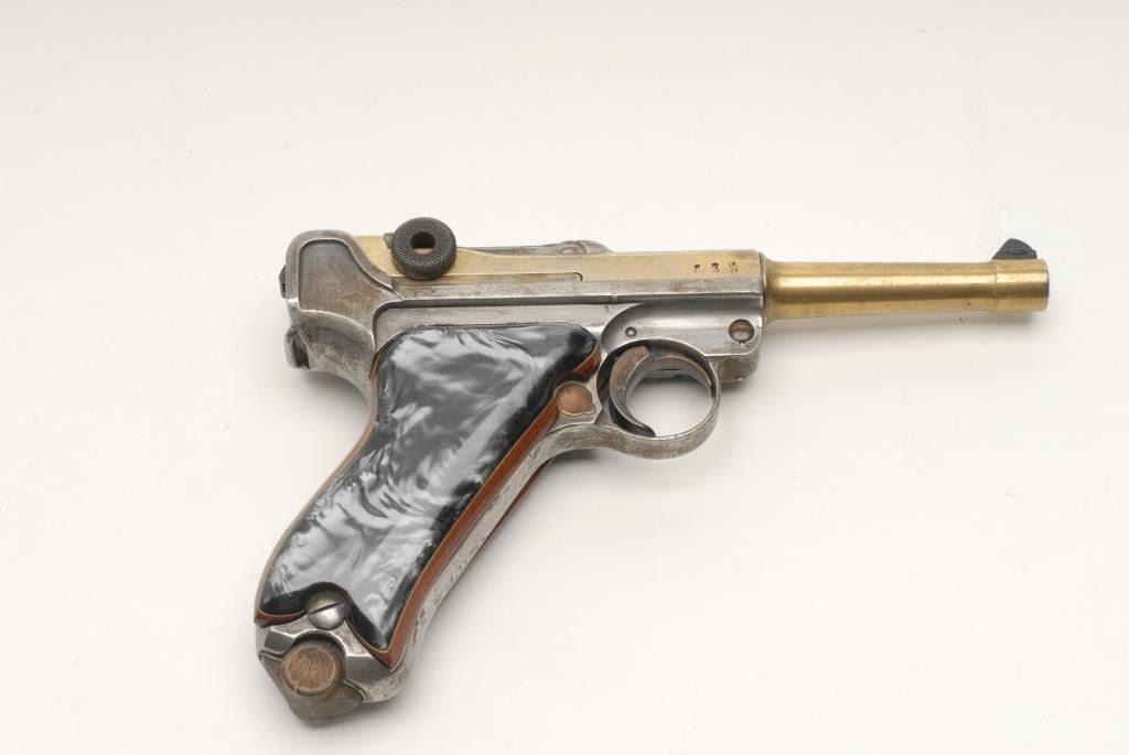 German Luger semi-automatic pistol by DWM dated 1910, 9mm caliber, 4” barrel, S/N 1094c, matching visible numbers except un-numbered wood base magazine; gold finish to barrel assembly, grey patina otherwise; good bore, action and markingsincluding “R.M.G. 103.4” stamping on front grip strap; imitation black pearl grips. (C&R/PPT). Est.: $600-$1,200.