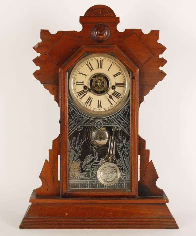 Victorian Mantel Clock with etched glass, complete, working condition unknown, slight damage. Est:$150-300