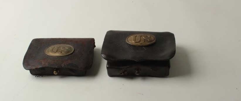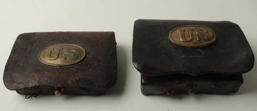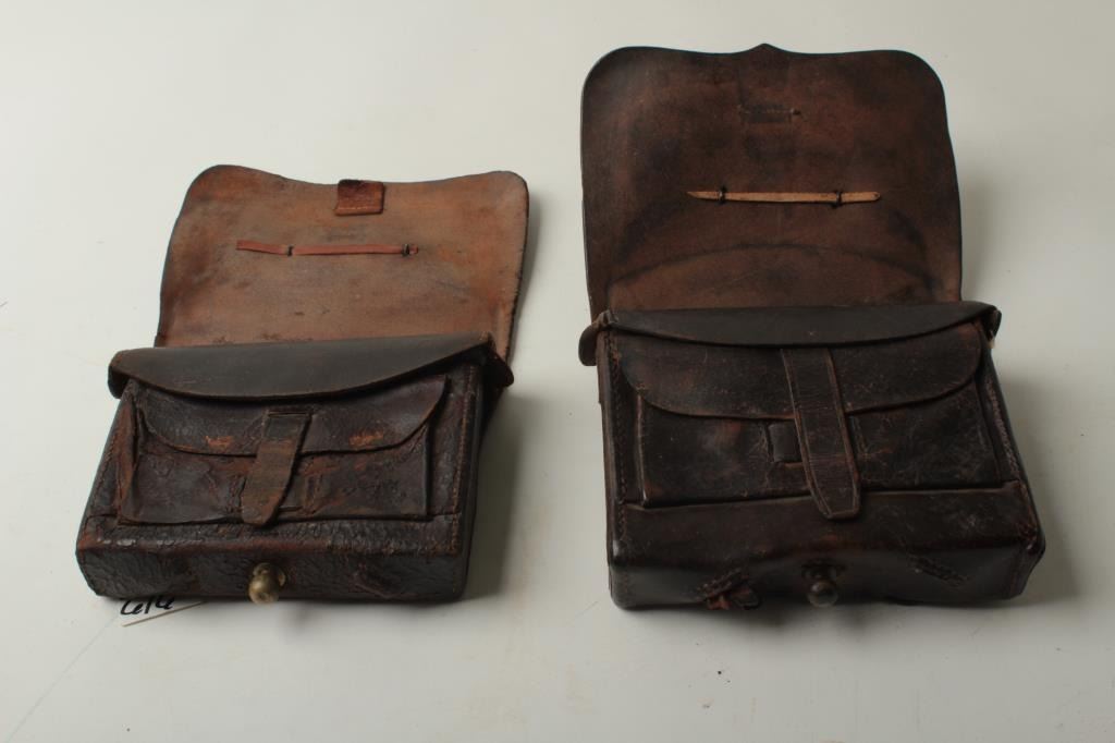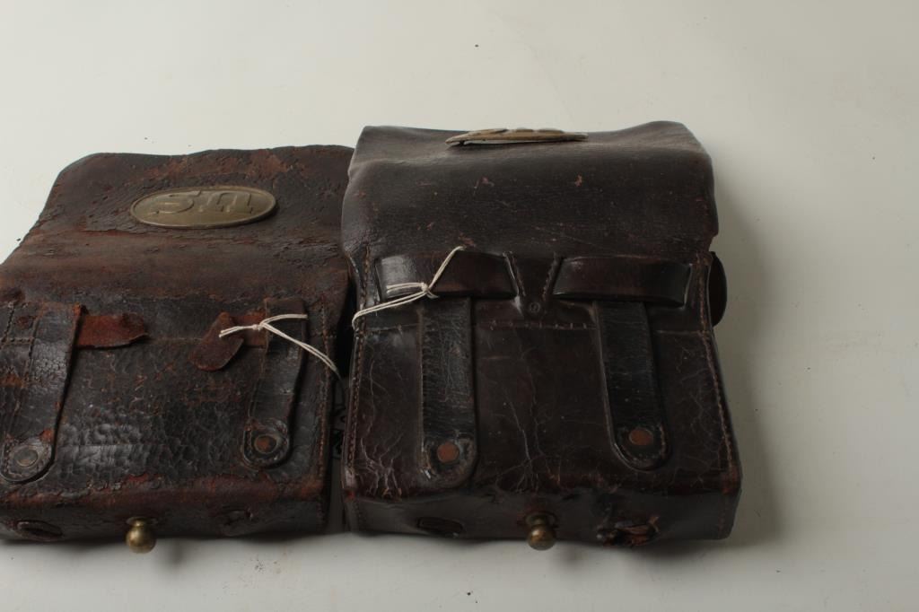 Lot of two Model 1855 leather cartridge pouches for .58 caliber combustible cartridges; both boxes have an original “US” brass plate on the top cover; both are missing the buckles and both are missing the closure tab; one pouch has one tin;both pouches show hard military use. Est.: $300-$600.