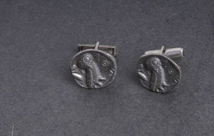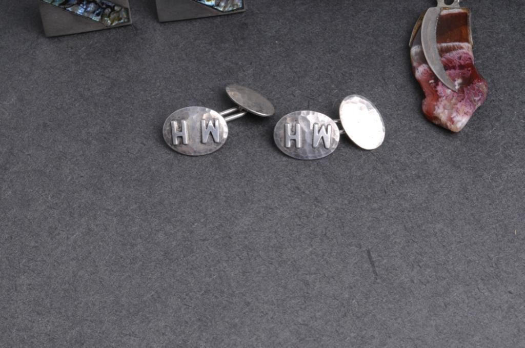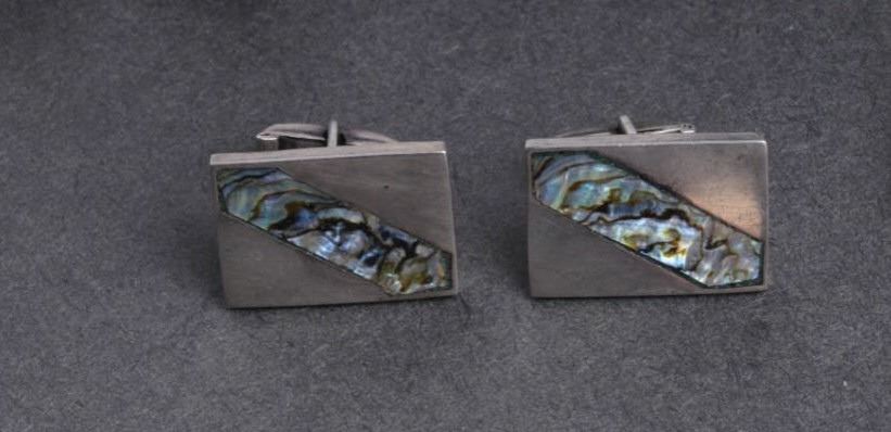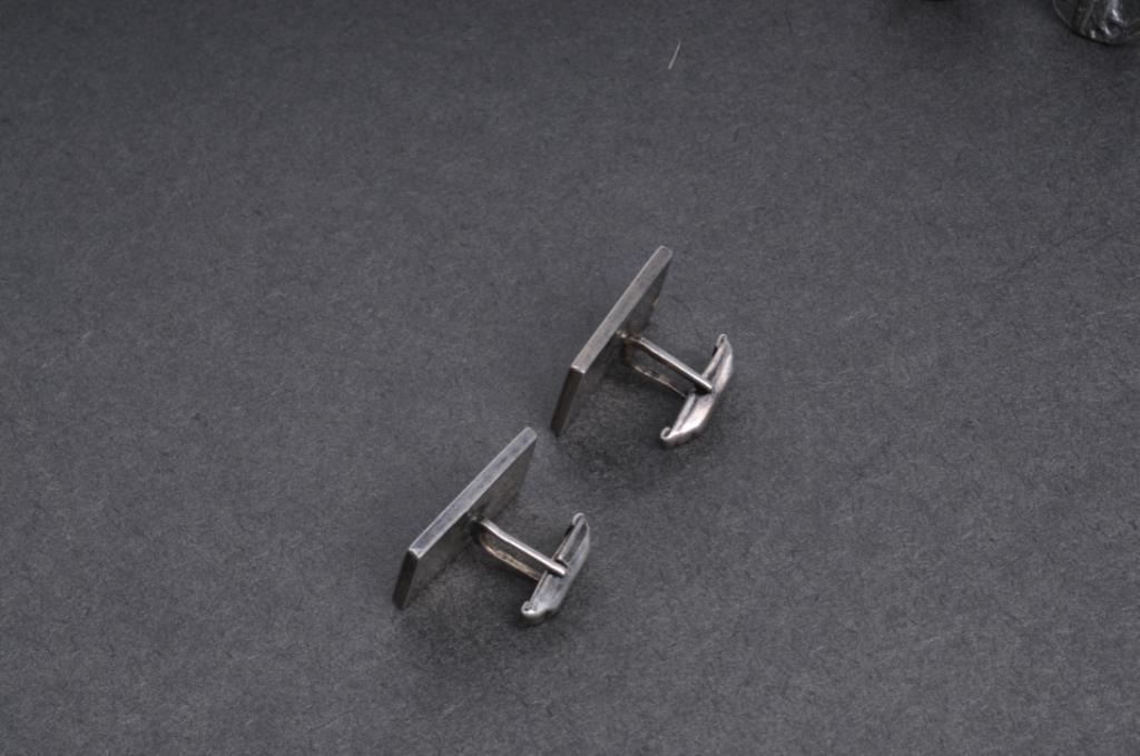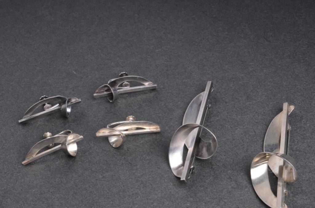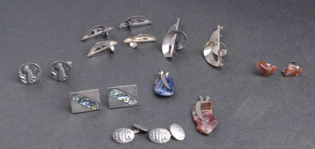 A unique collection of artistic silver jewelry containing 2 agate pendants and earrings, 2 modern brooches and matching earrings and 3 pairs of cufflinks . total silver weight 105gm EST:$175-200