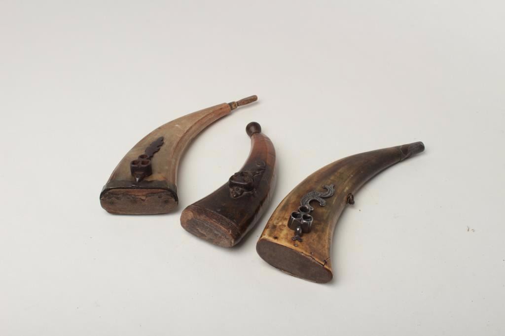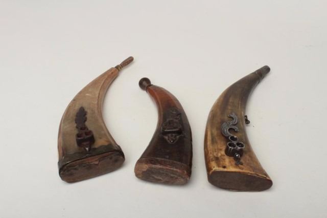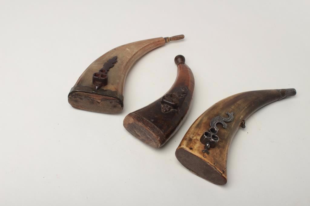 Ottoman or Balkan Horn Flasks, Lot of Three Flat horn flasks with Iron combination wrench tools applied to one face. Two retain wood stoppers. Good. All show even patina and moderate wear, minor cracks.Est:$300-500