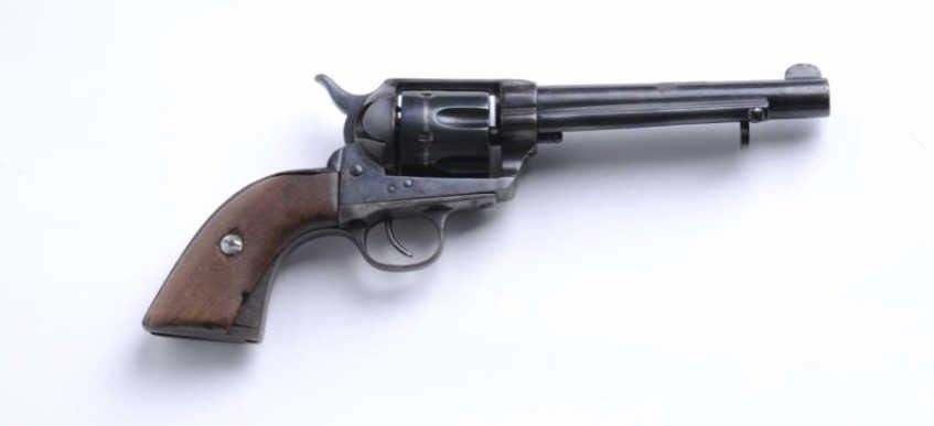 Crude period copy of Colt Single Action with fraudulent patent dates and markings about 1890, SN: 10559. About .44 caliber or 11MM but completely unsafe to shoot due to large gap between cylinder and barrel. Re-blued and gripsrepaired by a modern screw. Great for Mexican display or in a holster. (Antique) Est.: $250-$500