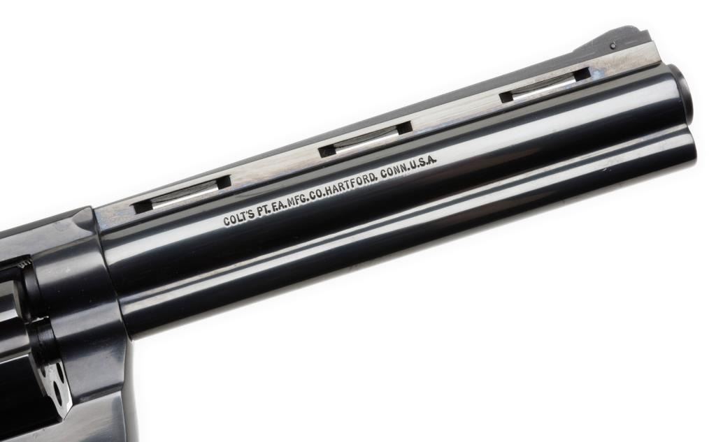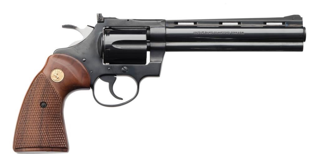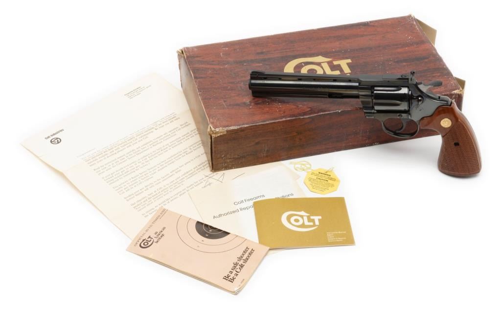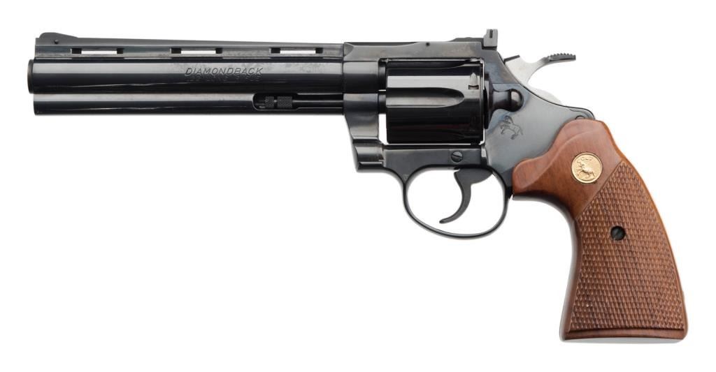 ++Colt Diamondback Model DA revolver, .22LR caliber, 6” ventilated rib barrel, S/N R56953, blued finish, checkered wood medallion combat grips with instructions, factory wood grained cardboard box and Styrofoam inserts. This gun isin like new condition showing little handling. The box end label is numbered to this gun; scattered scuffing and tears to box with end label present but separated. Est.: $600-$1,200.